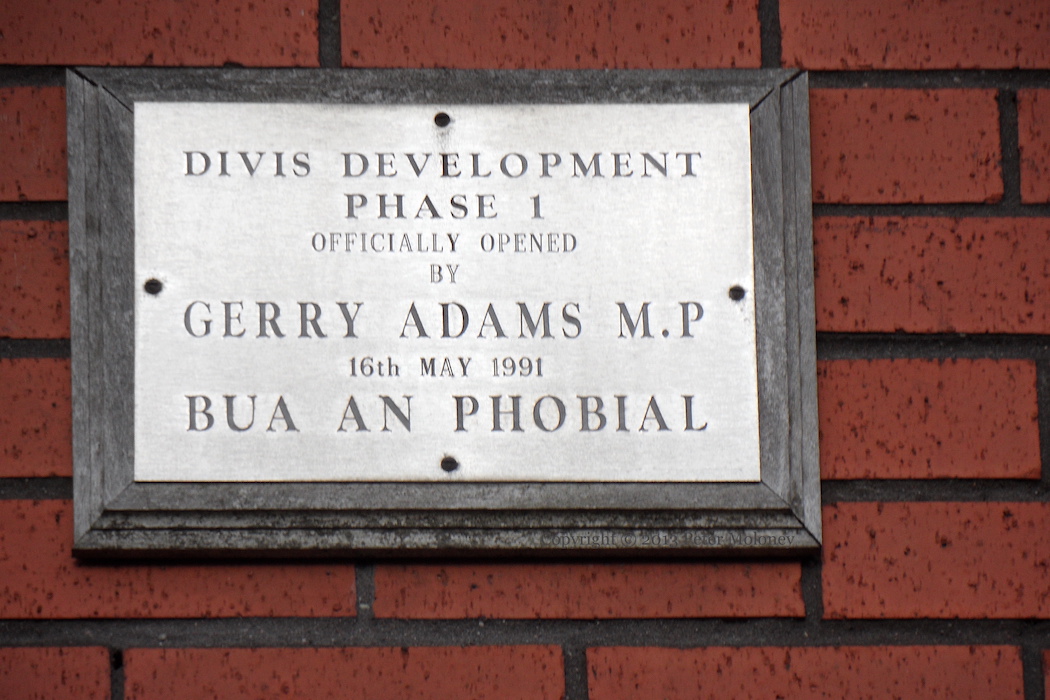 Also in Clonfadden Crescent can be seen a plaque commemorating the opening of “Divis Development Phase 1” by “Gerry Adams M.P” on May 16th, 1991. “Bua an phobıal” [“Bua an phobaıl”, “The community’s victory”] It took thirteen years of campaigning before the Executive agreed to knock down the old flats in 1986 (Alfaro & Roulston 2021).