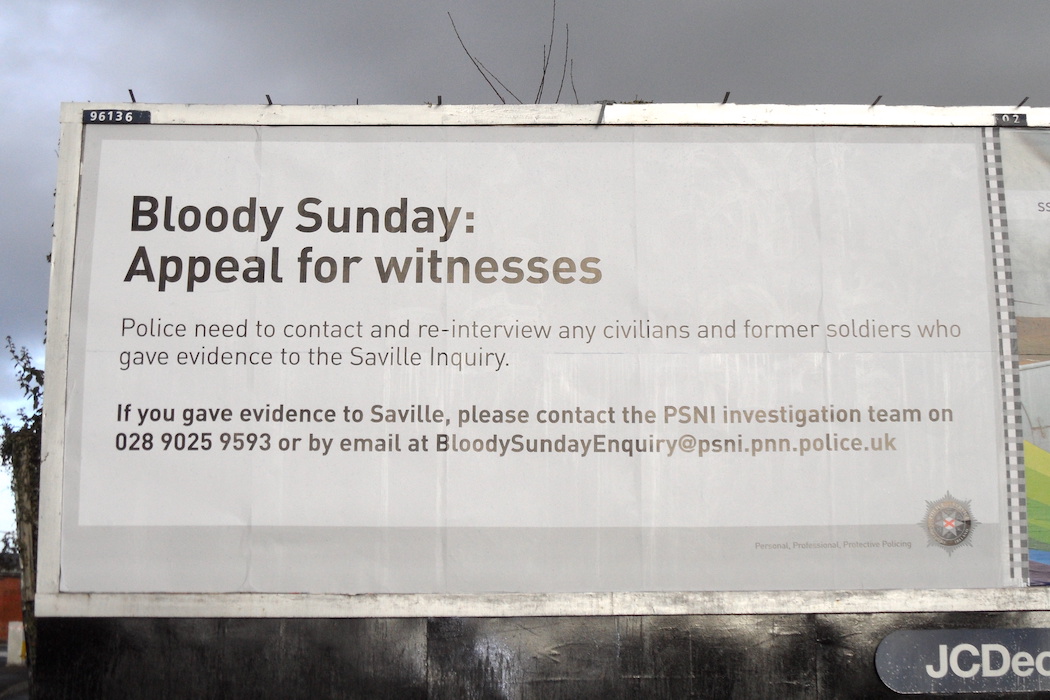 After the Saville report (gov.uk) was published in 2010 and the victims of Bloody Sunday were vindicated (see Vindicated/Ceartaıthe), the PSNI took up its own investigation into the events of Bloody Sunday (January 30th, 1972), which is still on-going. The hoarding above – appealing for “any civilians and former soldiers” who gave evidence to Saville – appeared in Letterkenny Road, Derry.
