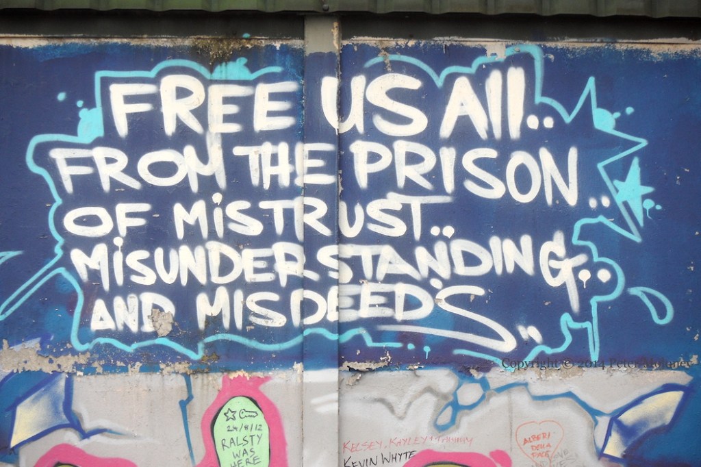 This piece of aspirational graffiti is on the Cupar Way “peace” line. “Free us all .. from the prison .. of mistrust .. misunderstanding .. and misdeeds.” It goes back to the the very first wild-style writing jam on the wall, in April 2009.