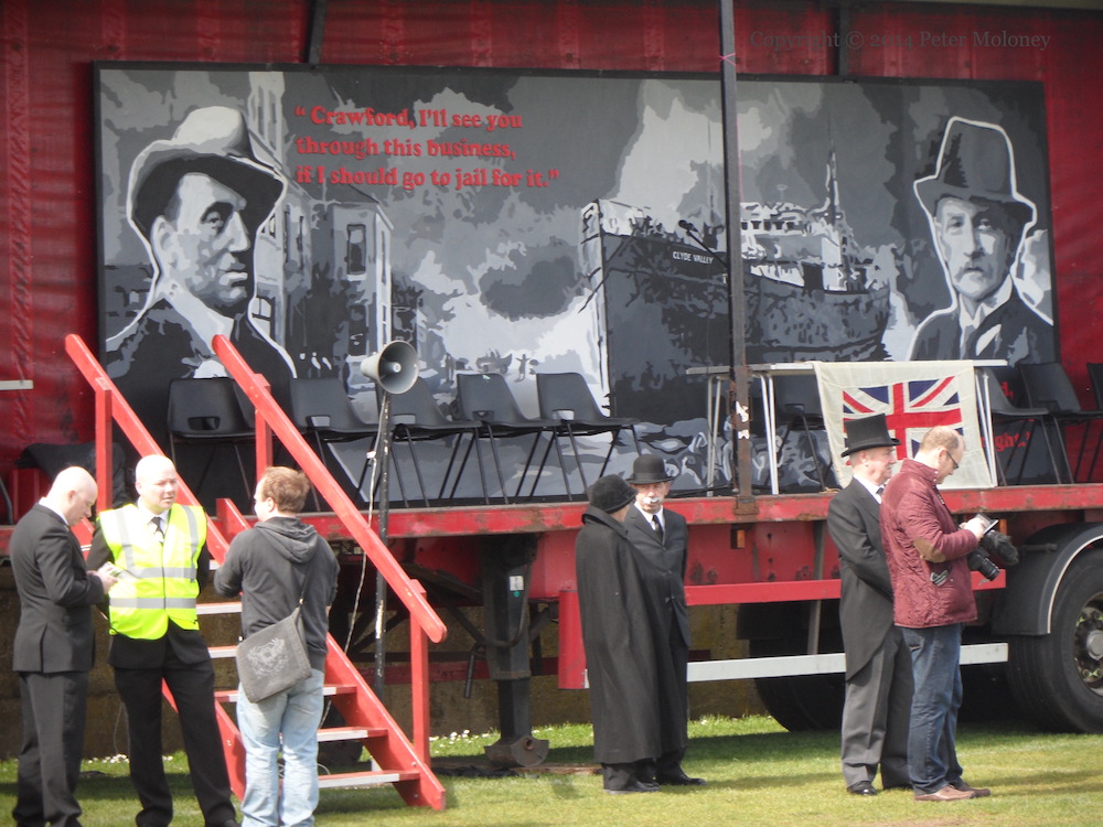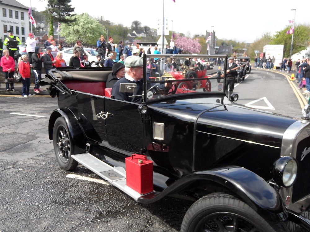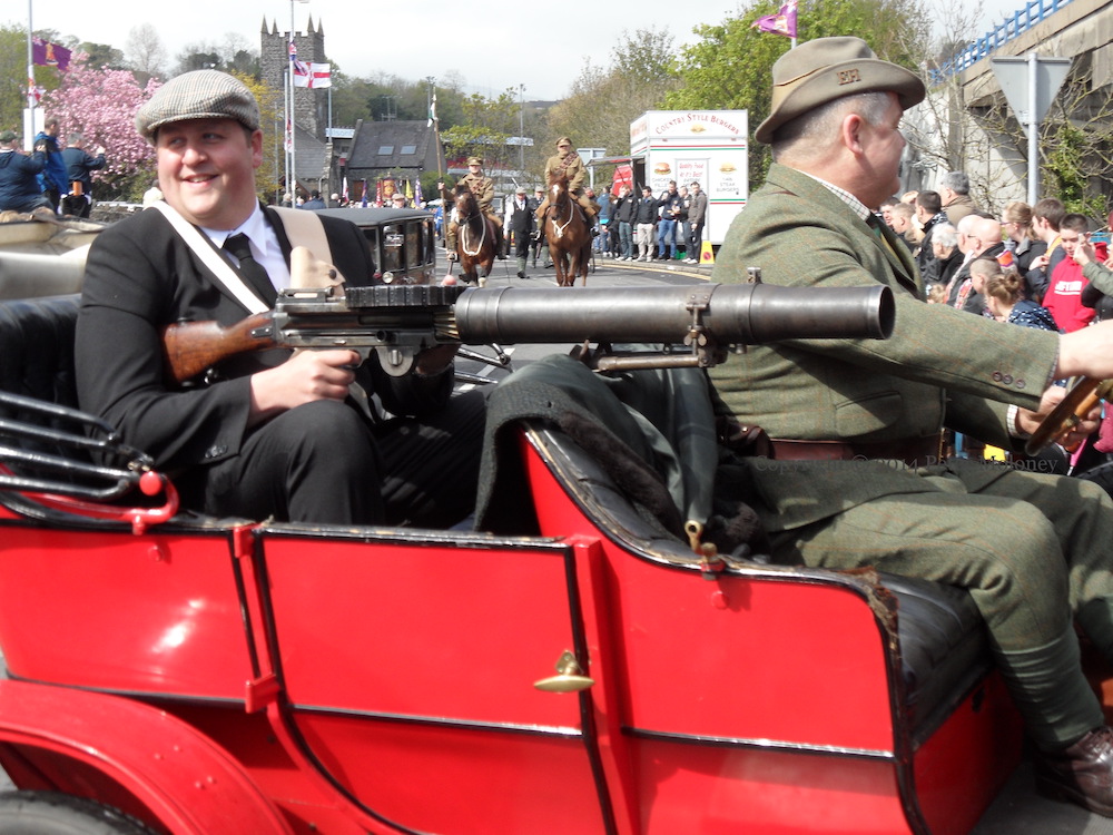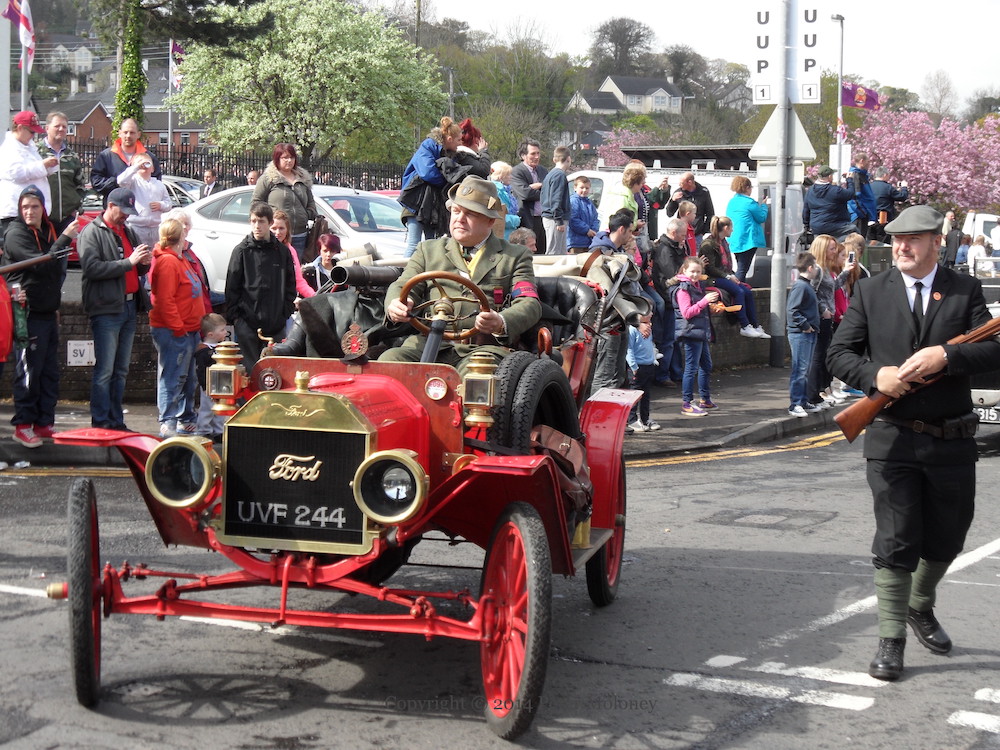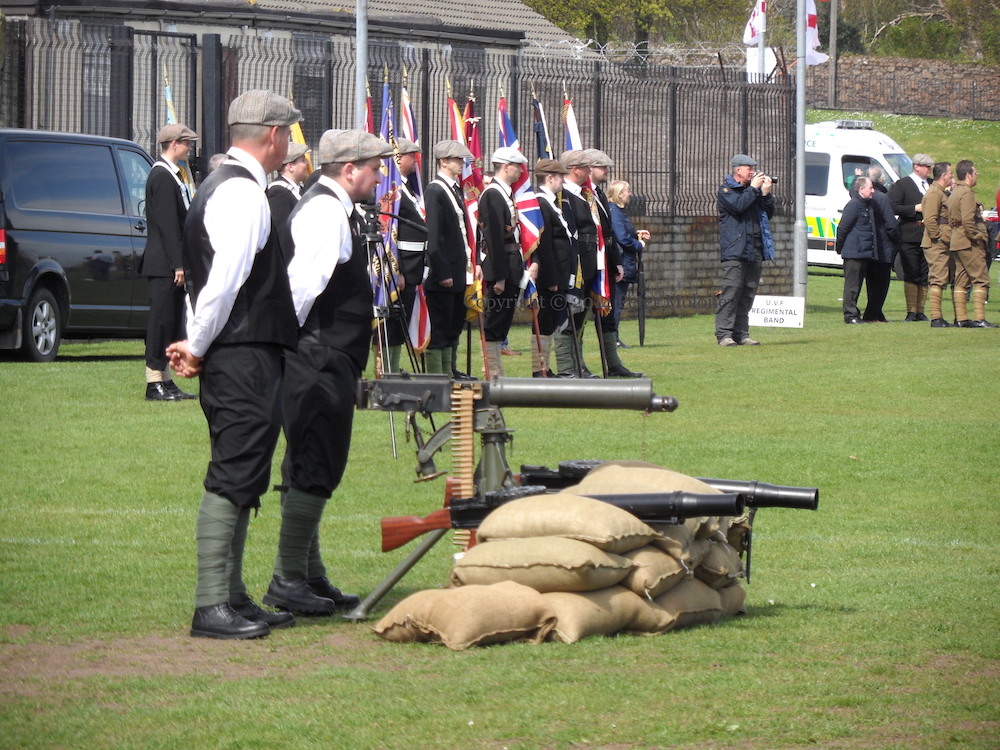 Here are a few images from the parade through Larne town (and speeches in Sandy Bay playing fields) to celebrate the centenary of the gun-running of April 24-25th, 1914, in which more than 30,000 rifles (rather than the Lewis gun and machine gun seen here) were smuggled into Ireland and dispersed to the various groups of Ulster Volunteers by horseless carriage (i.e. motor-car), in order to thwart the passage of the Home Rule bill.