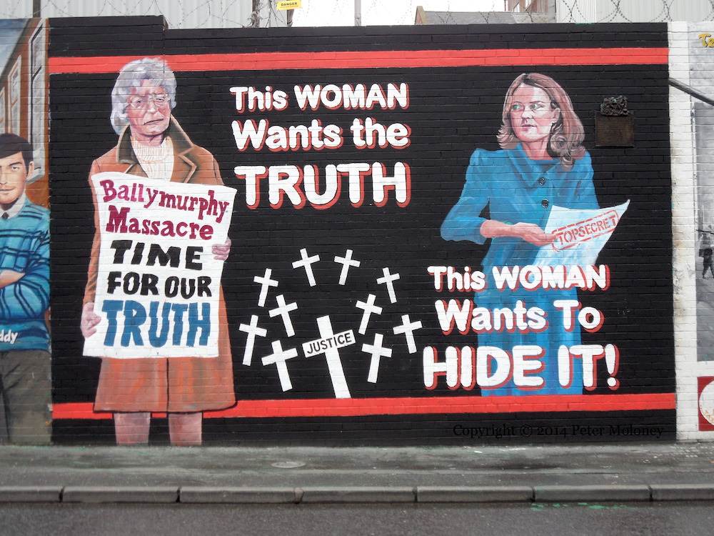 “This woman wants the truth – this woman wants to hide it.” NI Secretary Theresa Villiers (depicted on the right) refused to order further investigation of the shooting deaths of 11 Ballymurphy residents – one for each cross shown – in 1971 (BelTel) and also the La Mon restaurant fire-bombing in which 12 people died (BelTel).