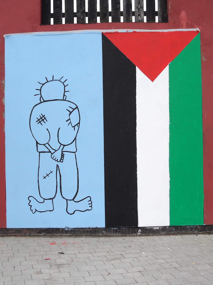 Handala is a cartoon character of Palestinian resistance to Israeli occupation and apartheid (WP). He appears here next to the Palestinian flag outside the Museum Of Free Derry (web) in the Bogside.