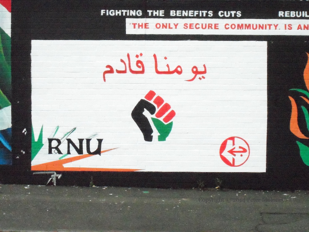 The ‘Vote Tommy Doherty’ portion of this RNU mural on Northumberland Street (Visual History) has been replaced with a pro-Palestinian message – a clenched fist in the colours of Palestine between the emblems of the RNU and the Popular Front For The Liberation Of Palestine. The Arabic reads “Our day is coming”/”Tıocfaidh ár lá”.