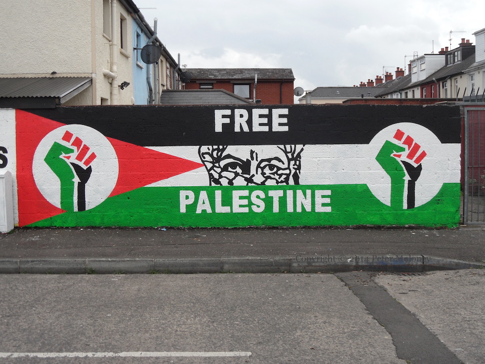 The wide shot shows the adjacent “Free Palestine” mural, also featuring the Palestinian flag.
