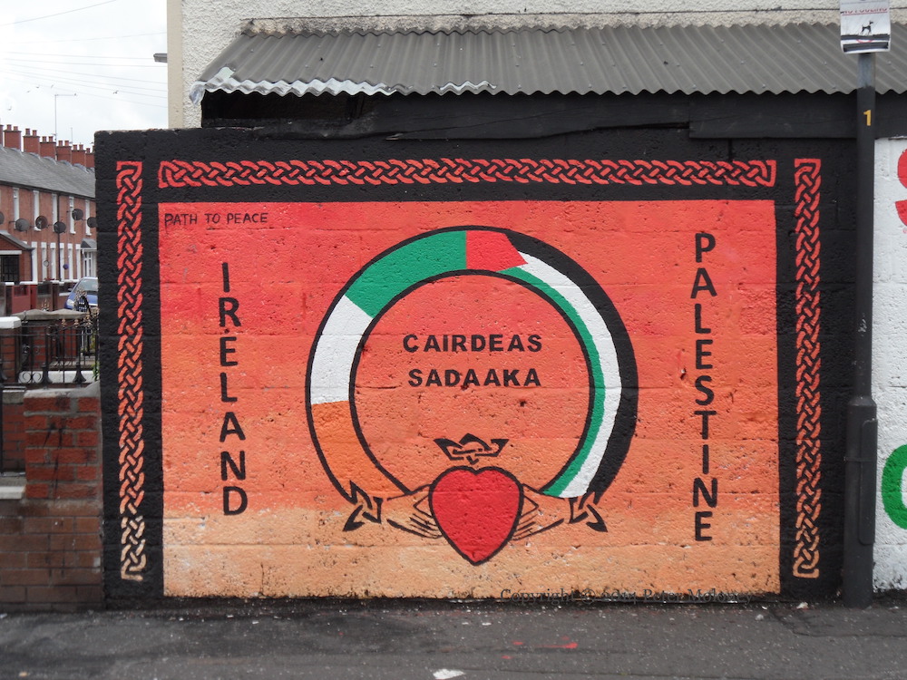 A Claddagh ring connotes friendship (caırdeas – sadaaka (صدقة)), love, and loyalty, here between Ireland and Palestine. The ring’s band is composed of their two flags.
