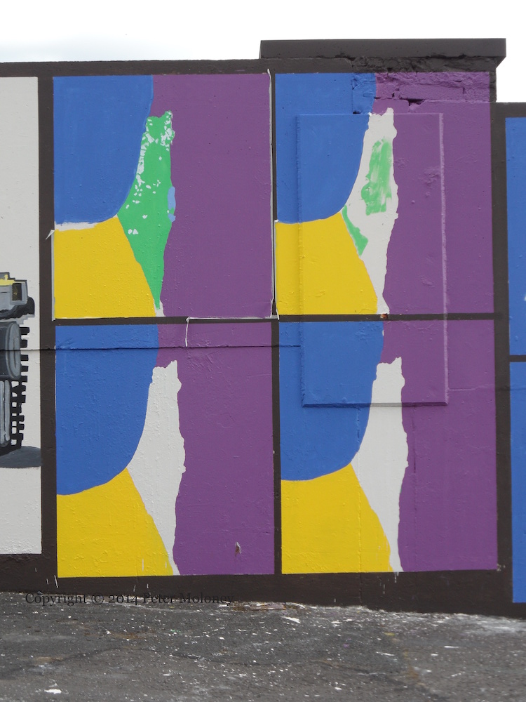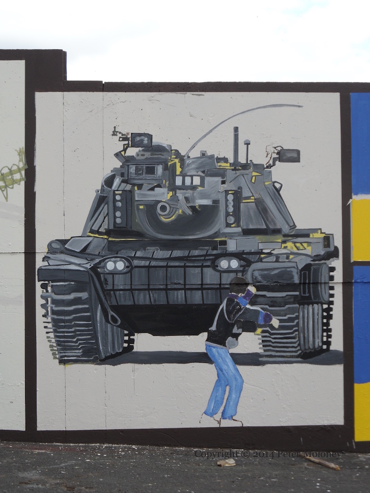 The second (from left to right) shows Palestinian teenager Faris Odeh throwing a rock at an Israeli tank; Odeh was shot and killed a few days later (WP). The AP photograph on which the mural is based can be seen in this May 2012 edition of (the Pakistani) The Nation.