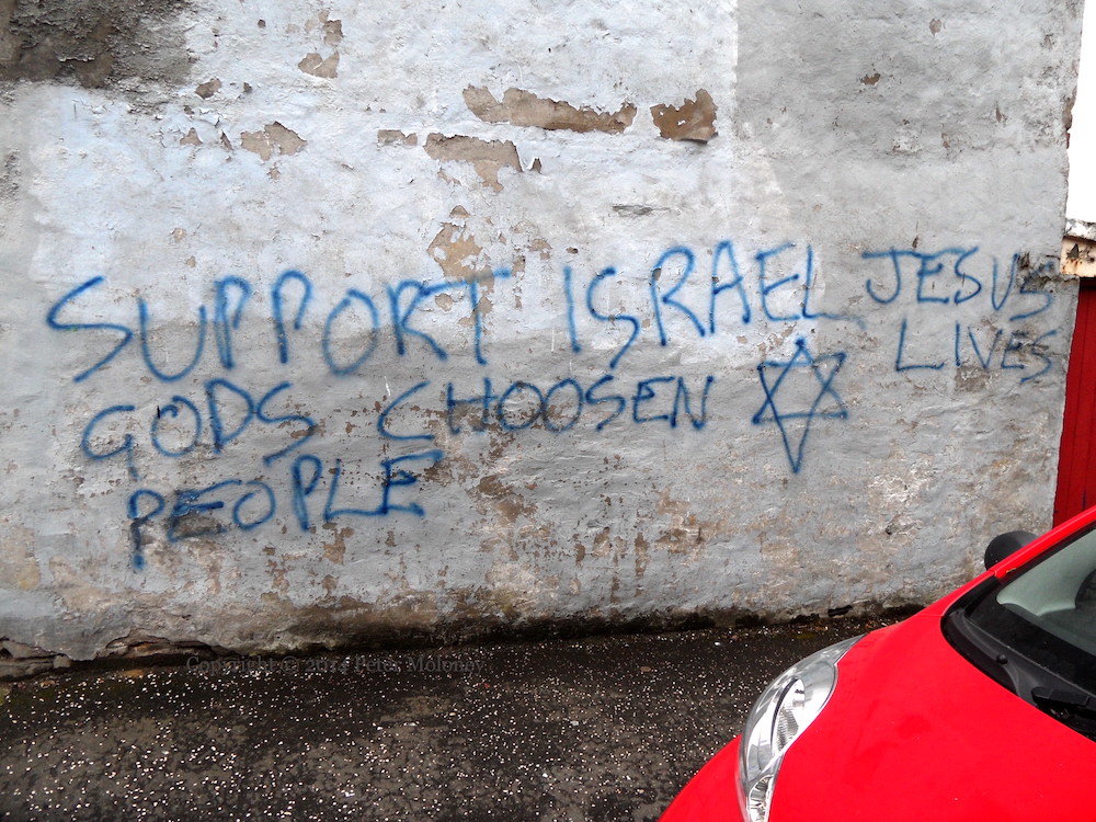 God’s Chosen People 2014-08-302024-12-13Extramural Activity “Support Israel, God’s chosen people. Jesus lives.” Graffiti in May Street, Waterside, Londonderry. Click image to enlargeCopyright © 2014 Peter MoloneyM11608 Share this: Click to share on X (Opens in new window) X Click to share on Facebook (Opens in new window) Facebook Like Loading... Related