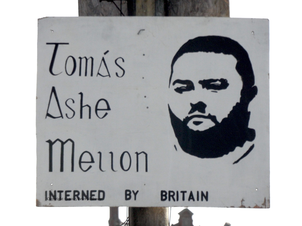 This board protesting Mellon’s “intern[ment] by Britain” is in Westland Street, in Derry’s Bogside.