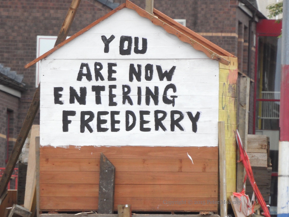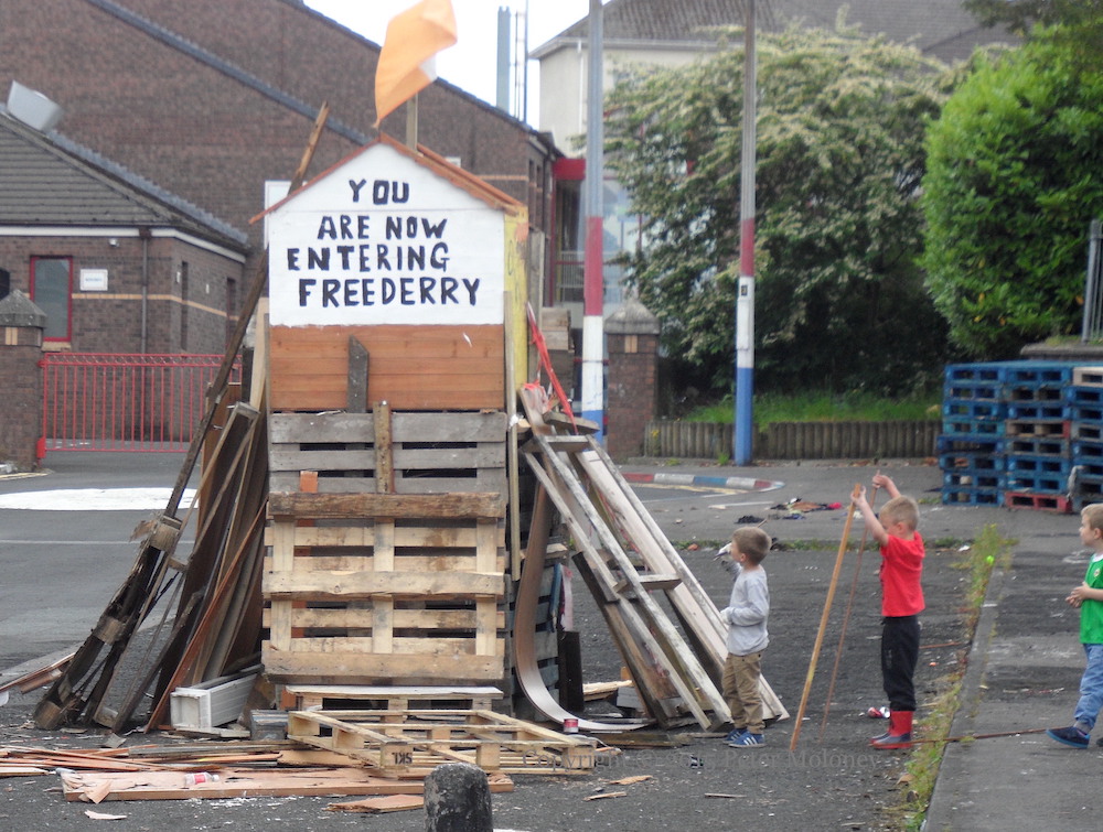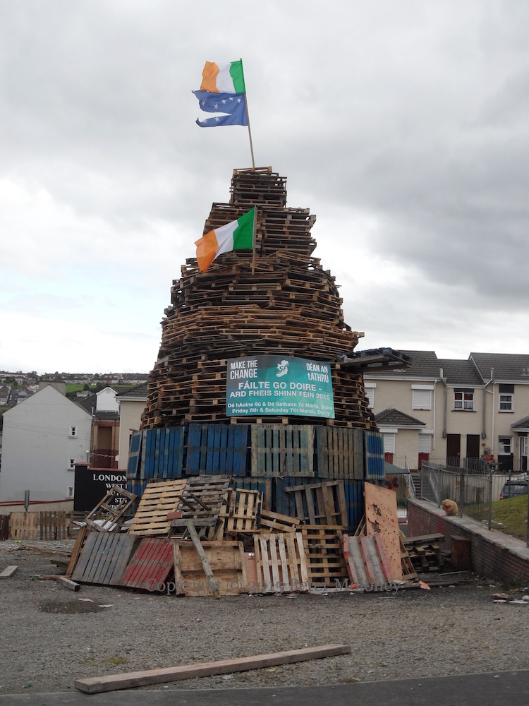 These are images of the 2015 Eleventh Night bonfires in the Fountain, Londonderry. In addition to the main bonfire there is a “children’s bonfire”, featuring a facsimile of Free Derry Corner.