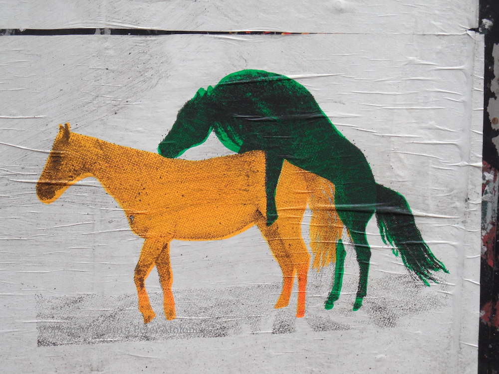 A paste-up by TLO: a green stallion mounts an orange mare.