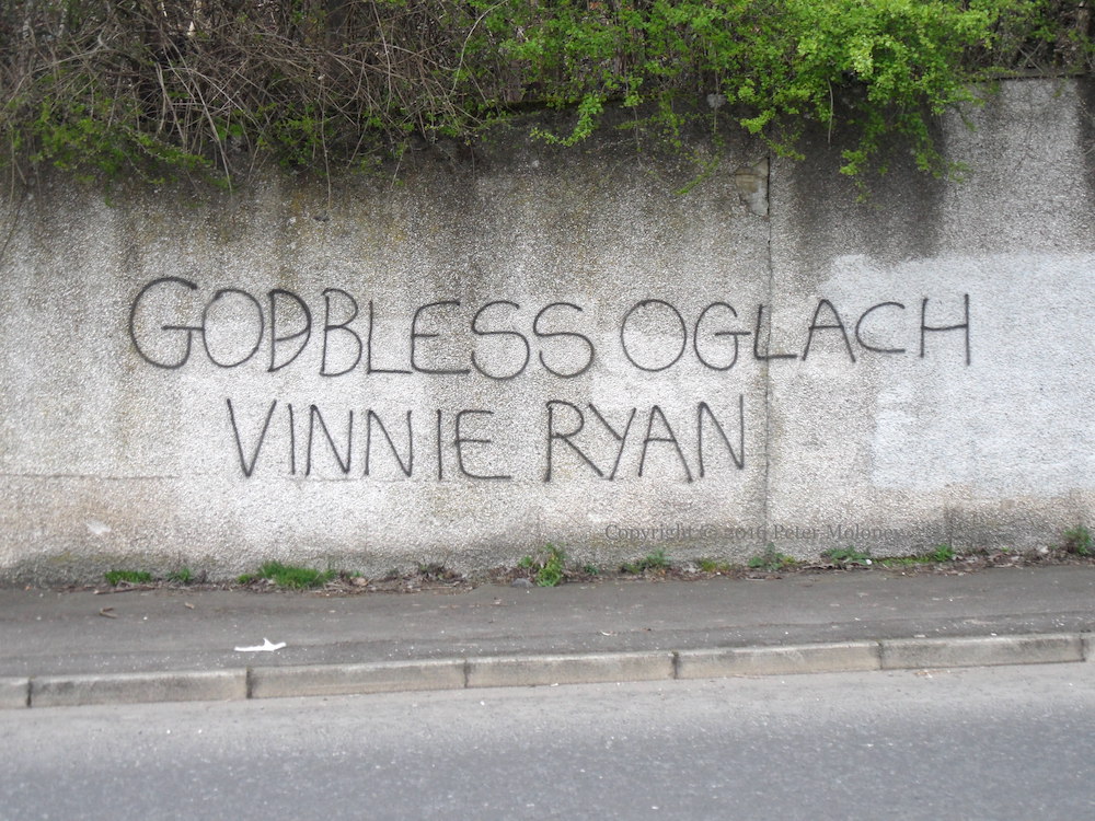 Vincent “Vinnie” Ryan, brother of Alan Ryan, was shot in Finglas, Dublin, on February 29th. In the graffiti above he is given the title “óglach” but his family denied that he was in the (Real) IRA (BBC). In 2019, two people were convicted for their roles in Ryan’s killing (Irish Times).