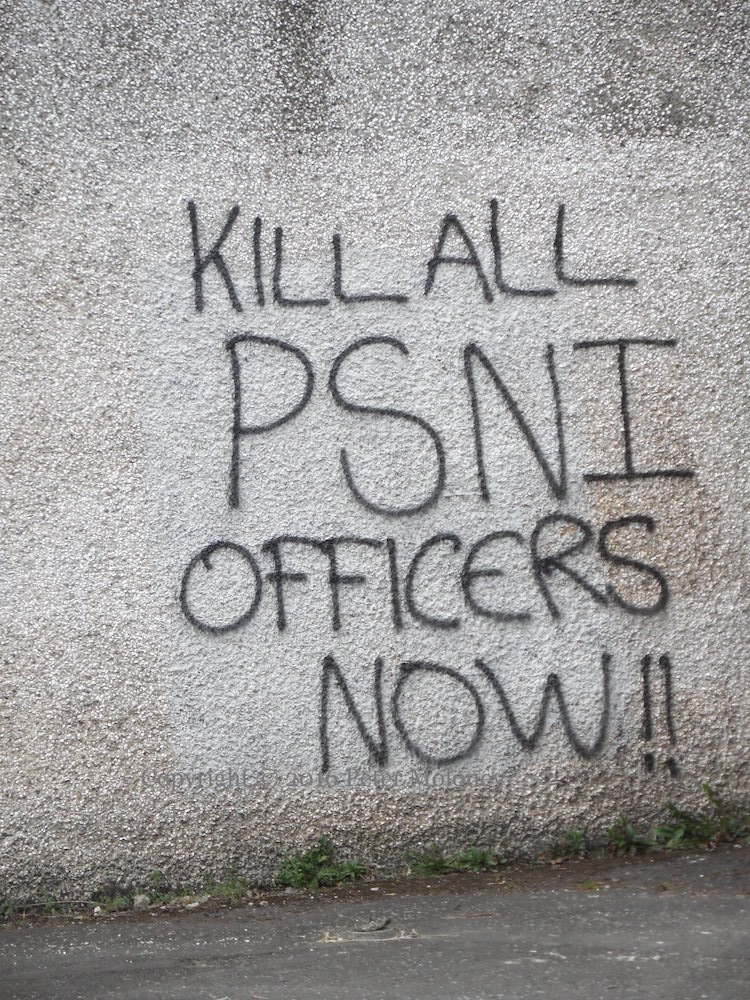 “IRA”, “God bless Óglach Vinnie Ryan”, “1916 – 2016 IRA Unfinished business”, “#JFTC2/Brits out”, “Kill all PSNI officers now!!”.