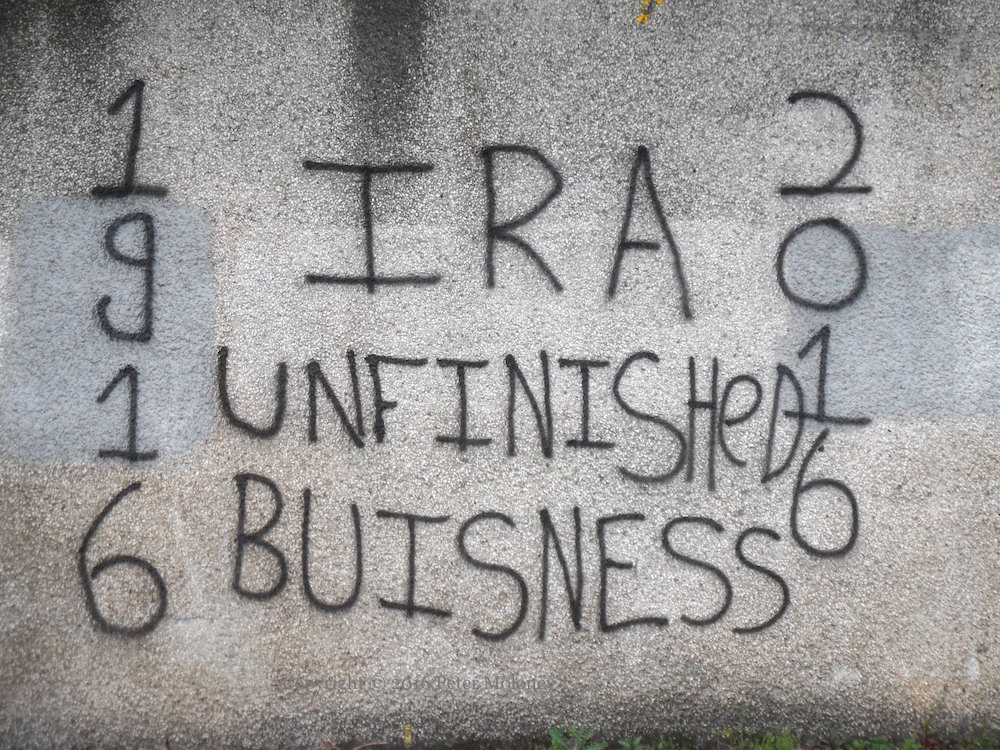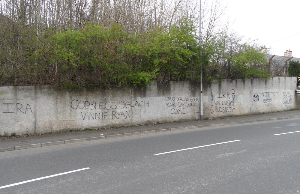 “IRA”, “God bless Óglach Vinnie Ryan”, “1916 – 2016 IRA Unfinished business”, “#JFTC2/Brits out”, “Kill all PSNI officers now!!”.