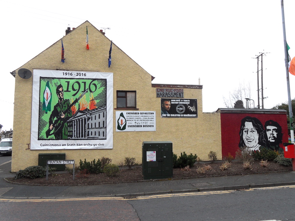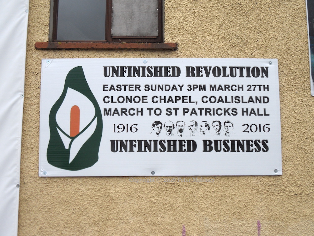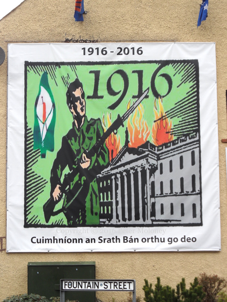 “Strabane remembers them forever” – the dead of the “unfinished revolution, unfinished business” of the 1916 Easter Rising. The central image on the large tarp is a modified version of the 1941 stamp designed by Victor Brown showing an armed volunteer outside the GPO (stampboards).