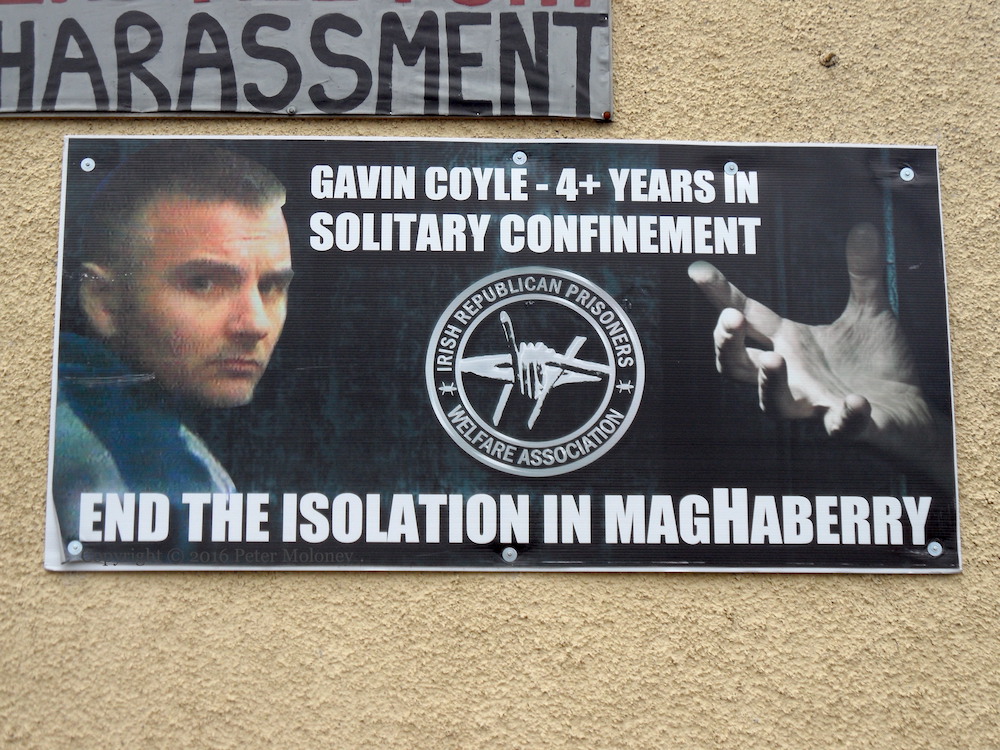 The IRPWA (web) board reads, “Gavin Coyle – 4+ years in solitary confinement. End the isolation in MagHaberry.” Coyle is serving ten years for possession of arms and explosives and is now charged with the 2008 death of off-duty PSNI officer (Guardian | BBC).