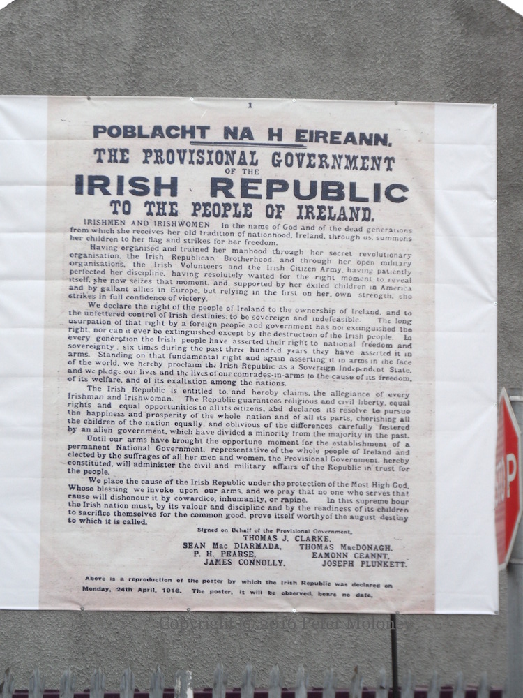 On April 24th, 1916, Patrick Pearse stood on the steps of Dublin’s General Post Office and read out a proclamation declaring an Irish republic; the proclamation had been prepared by the military council of the Irish Republican Brotherhood – Thomas Clarke, Seán Mac Dıarmada, Patrick Pearse, James Connolly, Thomas MacDonagh, Eamonn Ceannt, Joseph Plunkett – and their (printed) signatures were included at its end.