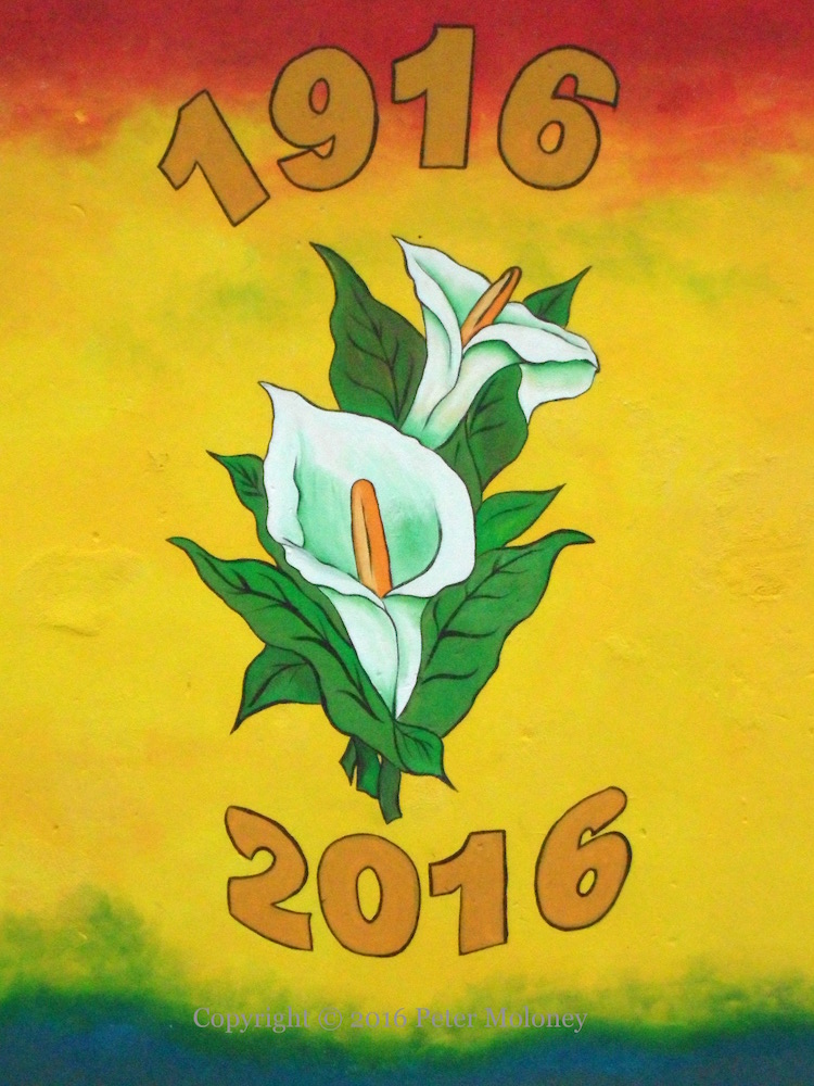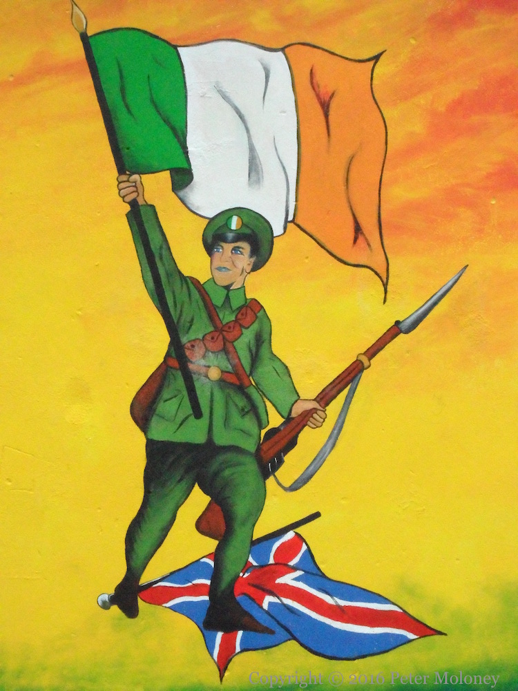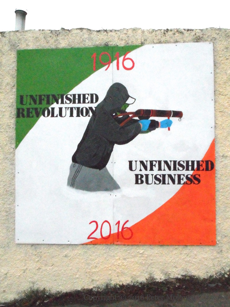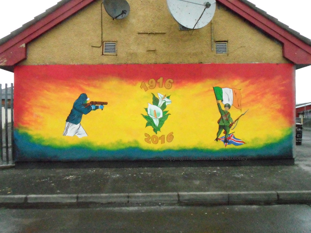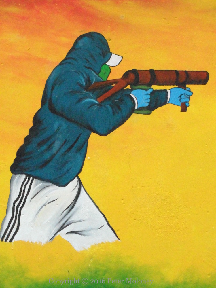 First, a new mural is currently in progress in Creggan. On the right, a soldier raises the Irish Tricolour while trampling on Britain’s Union Flag and the “unfinished revolution” of 1916’s Easter Rising (reproducing a postcard of the era). The modern-day figure on the left is wielding a home-made rocket-launcher used in a 2014 attack on police. It also appears in the board immediately above, and in 2015’s Resistance in Ardoyne, north Belfast.