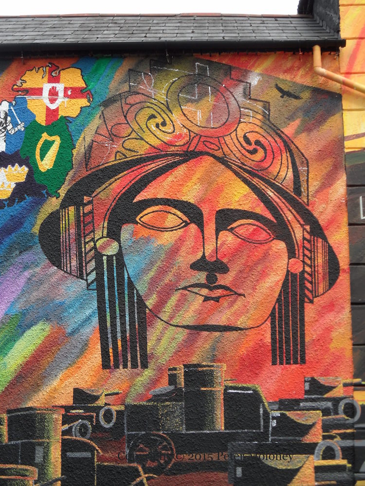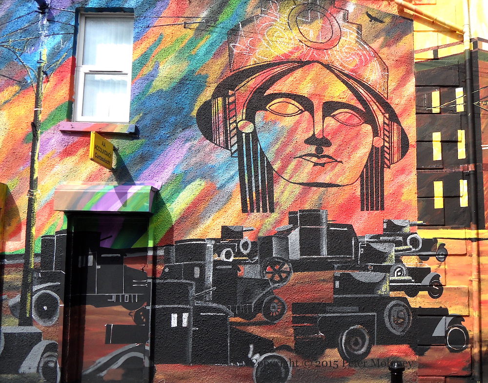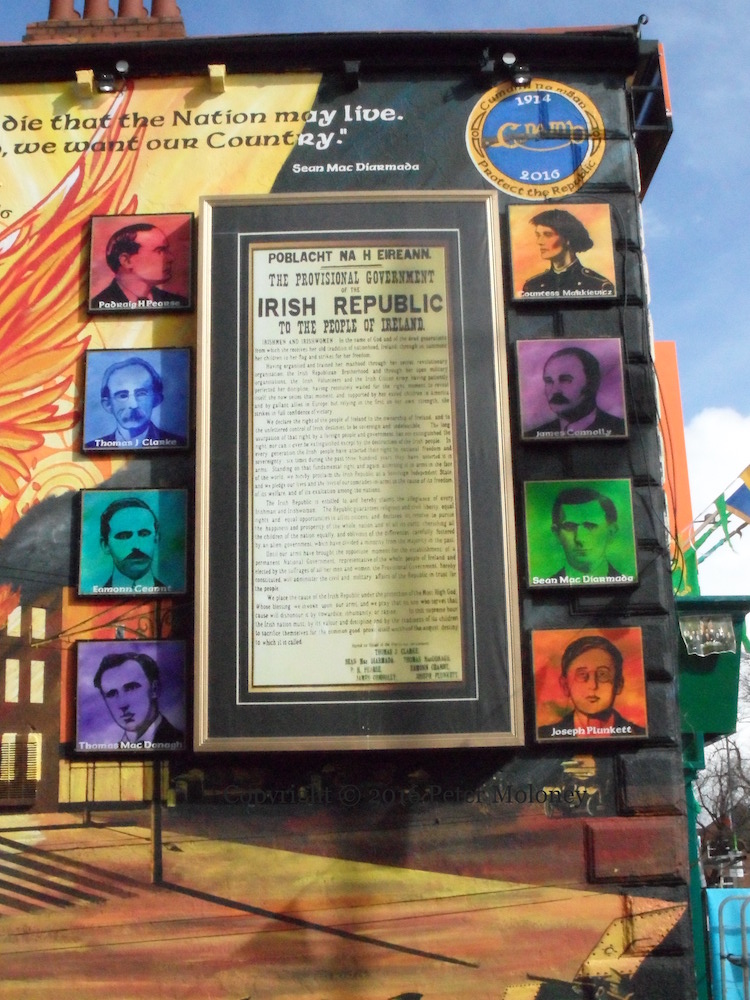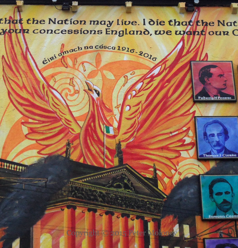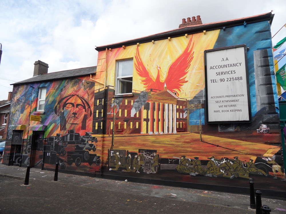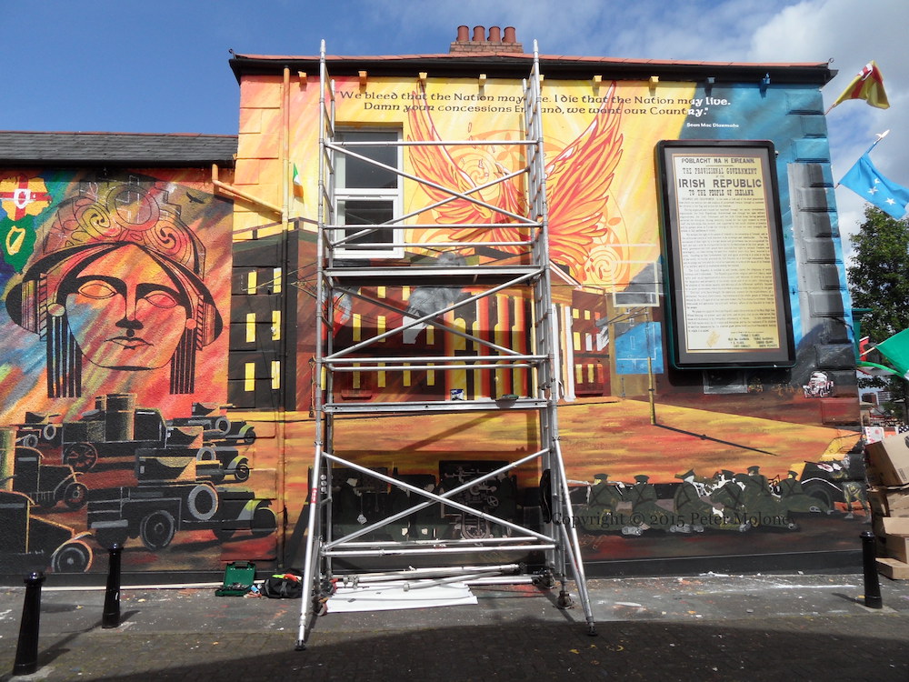 Arrayed against the forces of the British Army (which are shown laying siege to the Dublin GPO during the Easter Rising in armoured cars and in sniping positions in the foreground of the mural, along the whole length of the wall) are various symbols of Irish nationalism:
