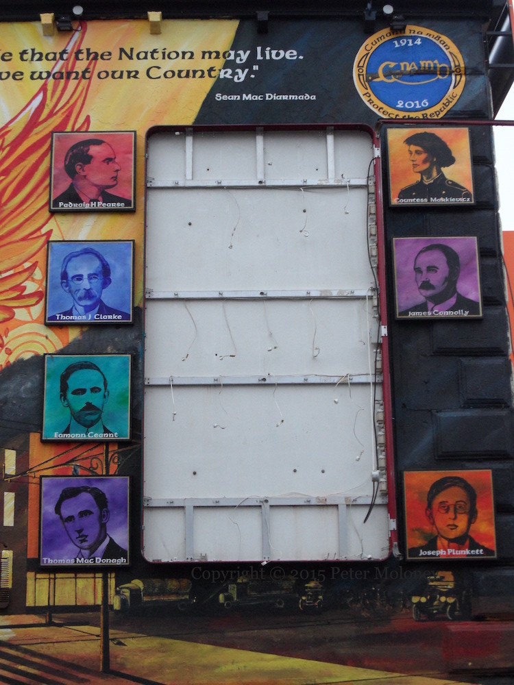 portraits of signatories and other rebels — (left) Padraig H. Pearse, Thomas J Clarke, Eamonn Ceannt, Thomas MacDonagh, (right) Countess Markievicz, James Connolly, Sean MacDiarmada, Thomas Plunkett;