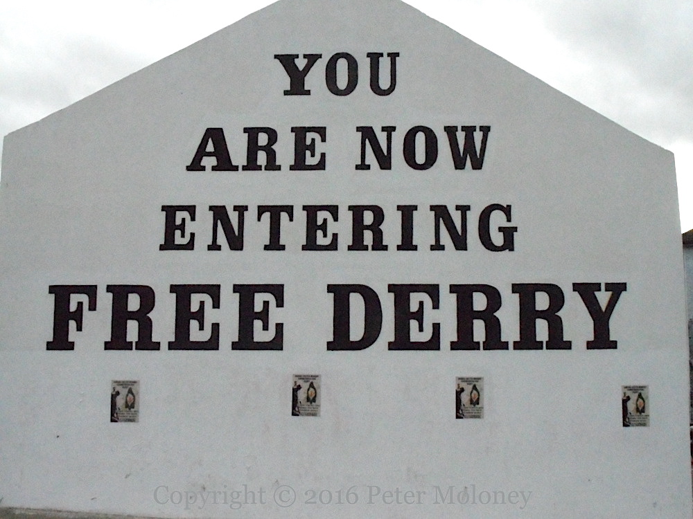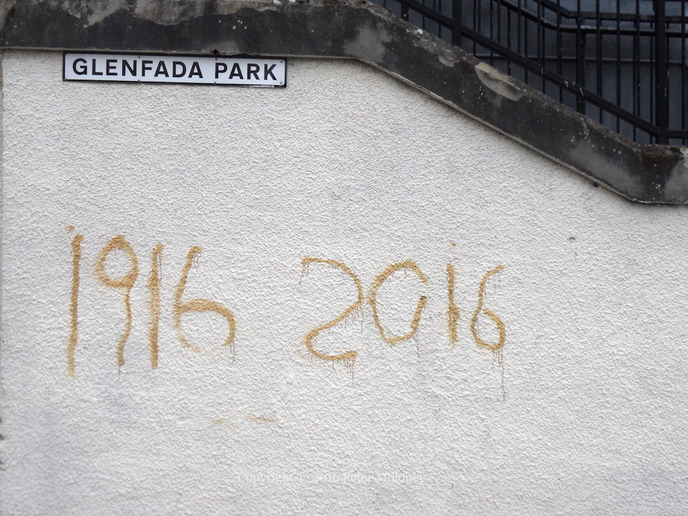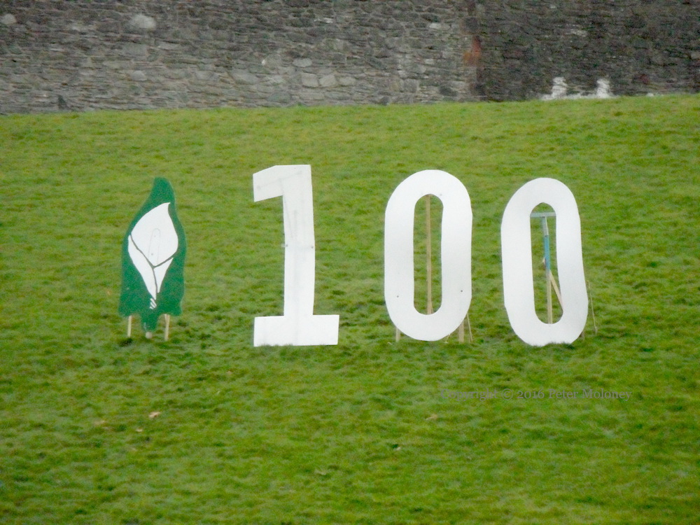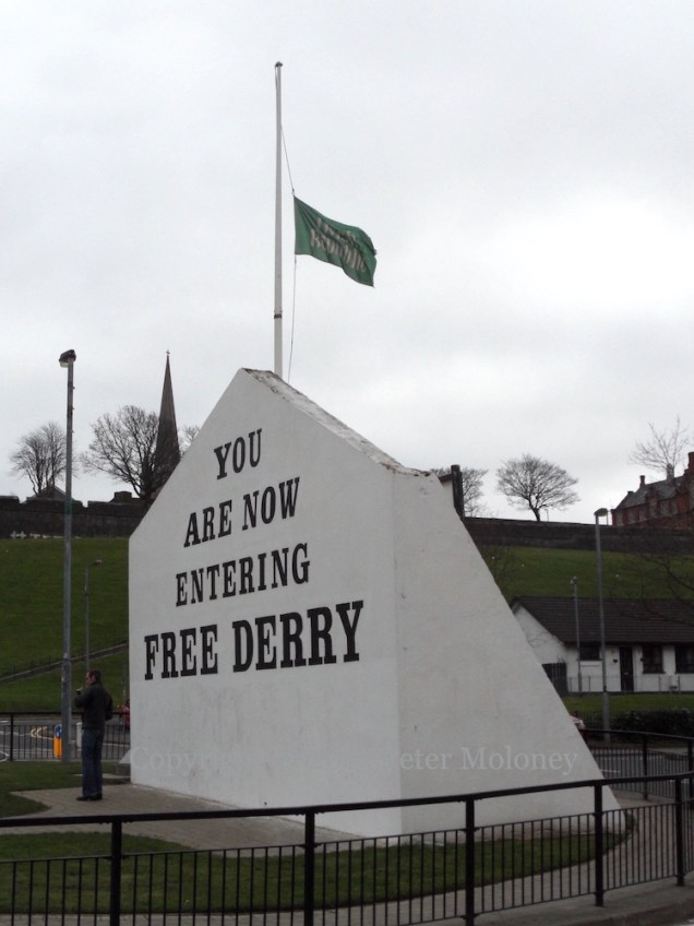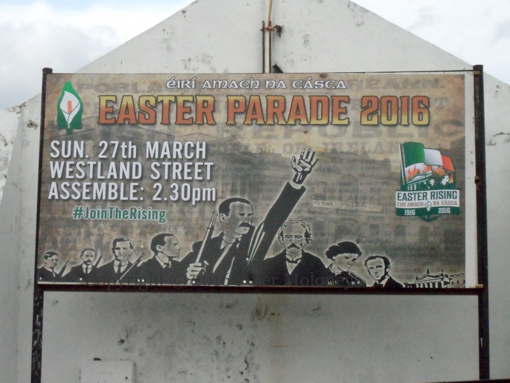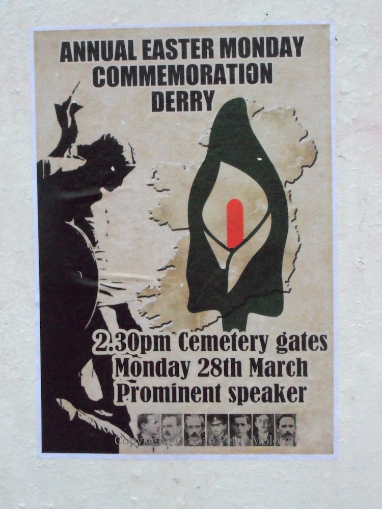 The flag of the “Irish Republic” – the kind that was flown over over the GPO during the Easter Rising/Éırí Amach Na Cásca in 1916 – flies over Free Derry Corner (Visual History) ahead of the Rising’s centenary in 2016. The posters were added a few days later, announcing a commemoration on Monday the 28th; the parade advertised on the rear of Free Derry Corner is on the 27th, which is also the date of the march in Coalisland.