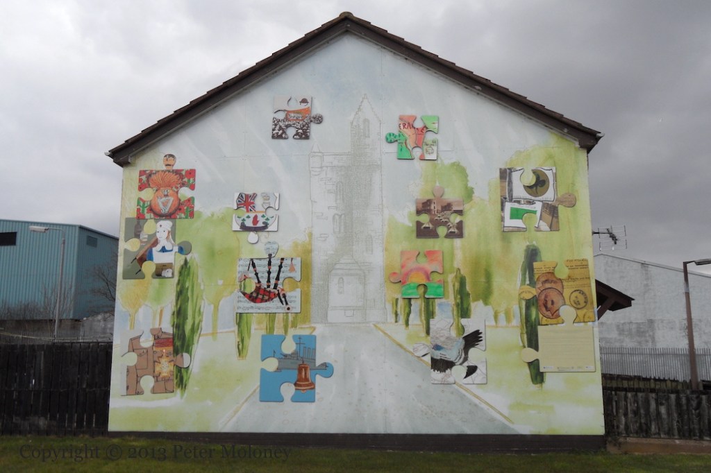 “This artwork, commemorating the sacrifices made during the Great War and subsequent conflicts, was produced by the young people of Parkhall Youth & Community Club and was completed in 2010. It is part of a larger Re-imaging project undertaken by Parkhall Cultural Awareness Association & Parkhall Community Association.