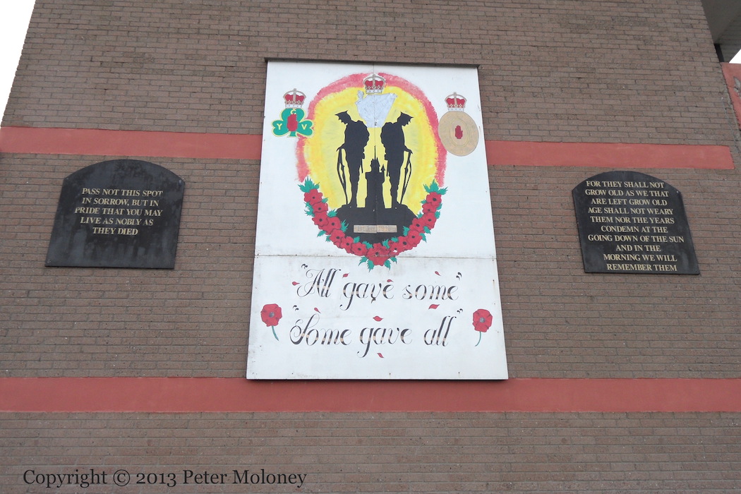 On the left: “Pass not this spot in sorrow but in pride/That you may live as nobly as they died.” These lines are also used in a WWI memorial mural in Carlingford Street, Belfast.