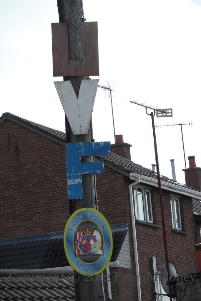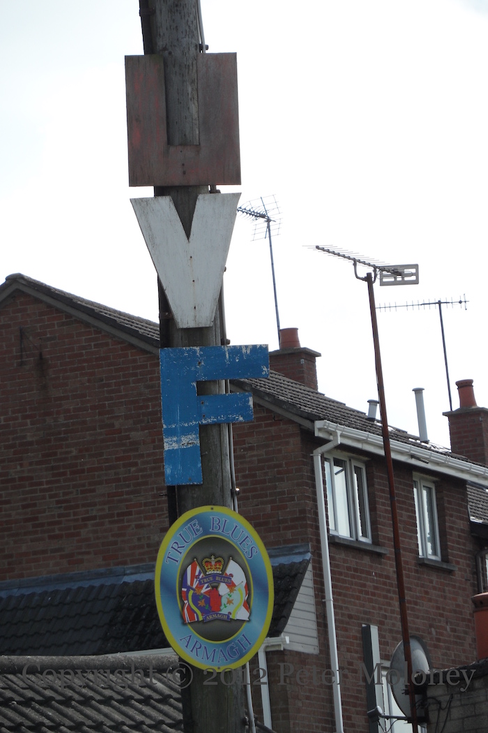 In the border, clockwise from left to right, we see: the Tandragee Idol (WP), Naomh Bríd/St Brigid’s, St Patrick preaching the trinity, Irish dancing, Gaelic football, Armagh Harps, “Ard Mhacha”, the Armagh county crest in colour in the apex (Club & County), “Armagh”, Na Pıarsaıgh Óga, hurling/camogie, Cú Chulaınn’s, mummers (perhaps specifically the Armagh Rhymers), Jonathan Swift, a steam locomotive (perhaps representing the Armagh rail disaster of 1889, in which 80 people died WP); a vintage image of Callan Street is depicted along the bottom (History Armagh).
