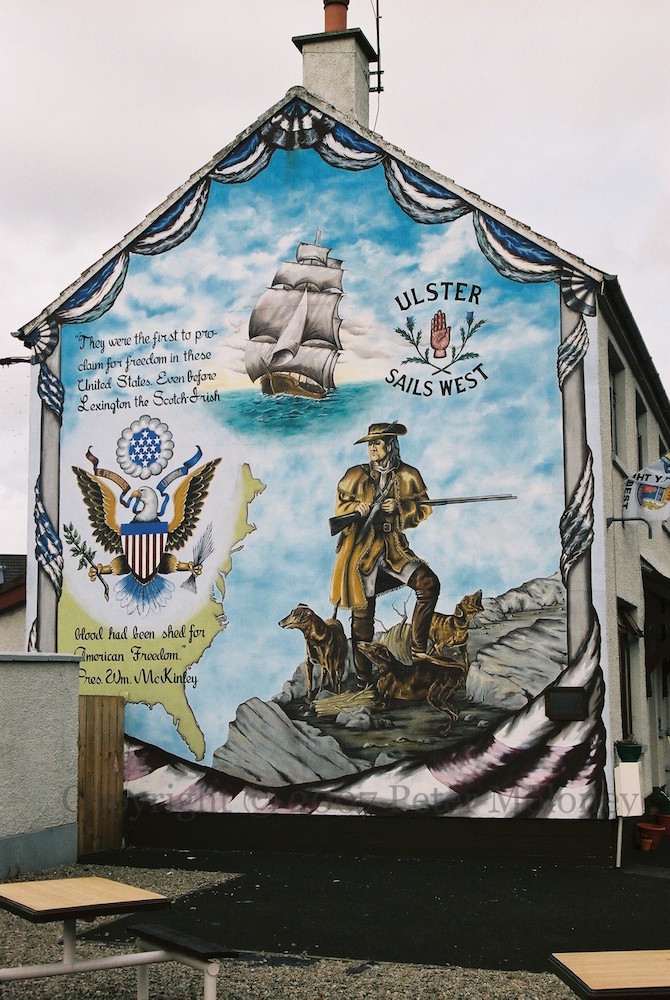 As the Visual History page on Ulster-Scots Murals shows, most of these murals made a connection to (what would-become) the United States, to where about a quarter million people emigrated (WP). The mural is intended to tell a story of emigration (signified by the sailing ship), American independence (the McKinley quote), and American expansion (the frontiersman).