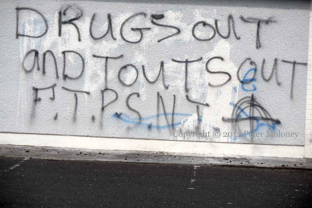 “Drugs out and touts out. FTPSNI” with a ‘target’ symbol.
