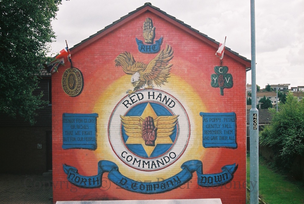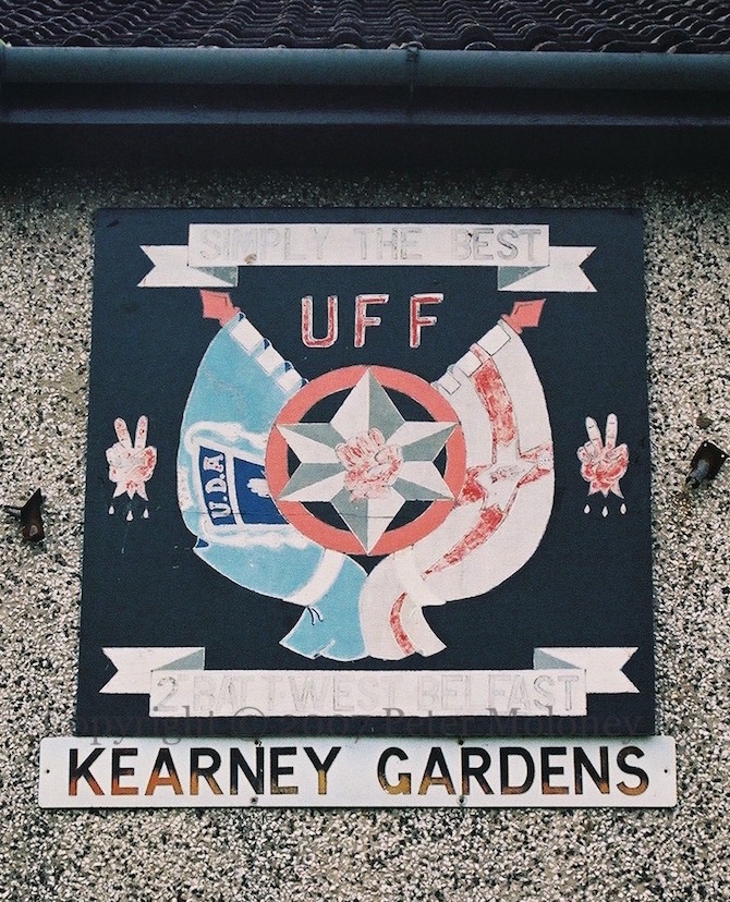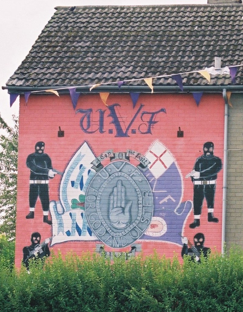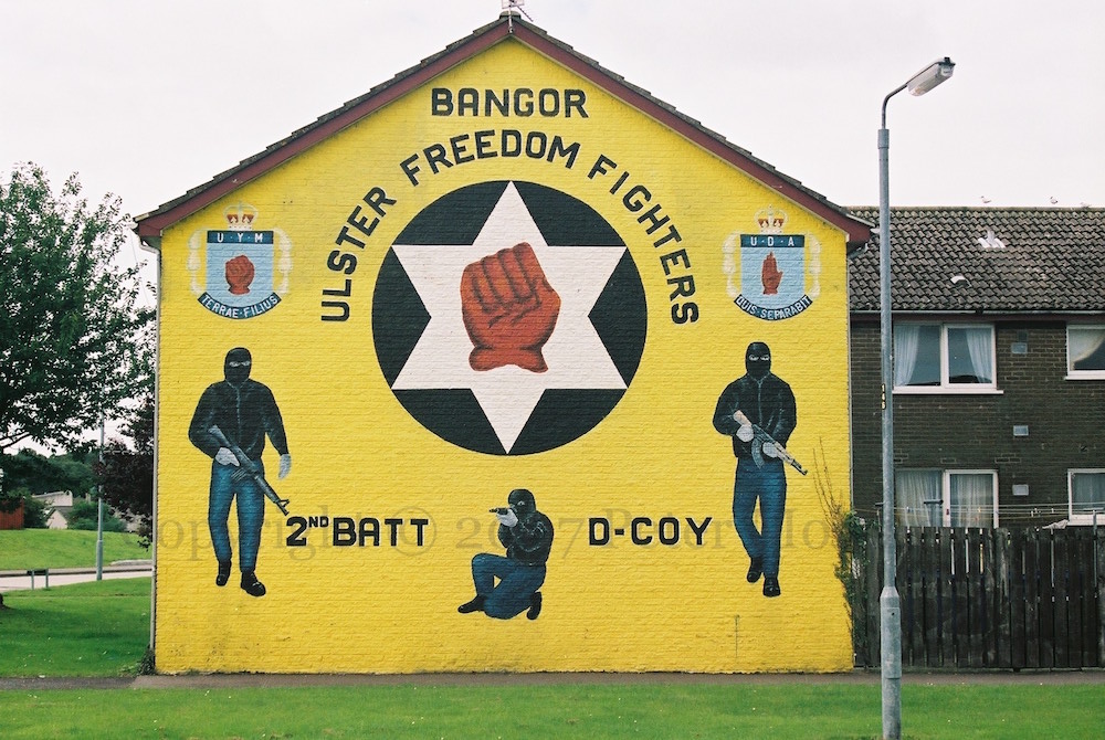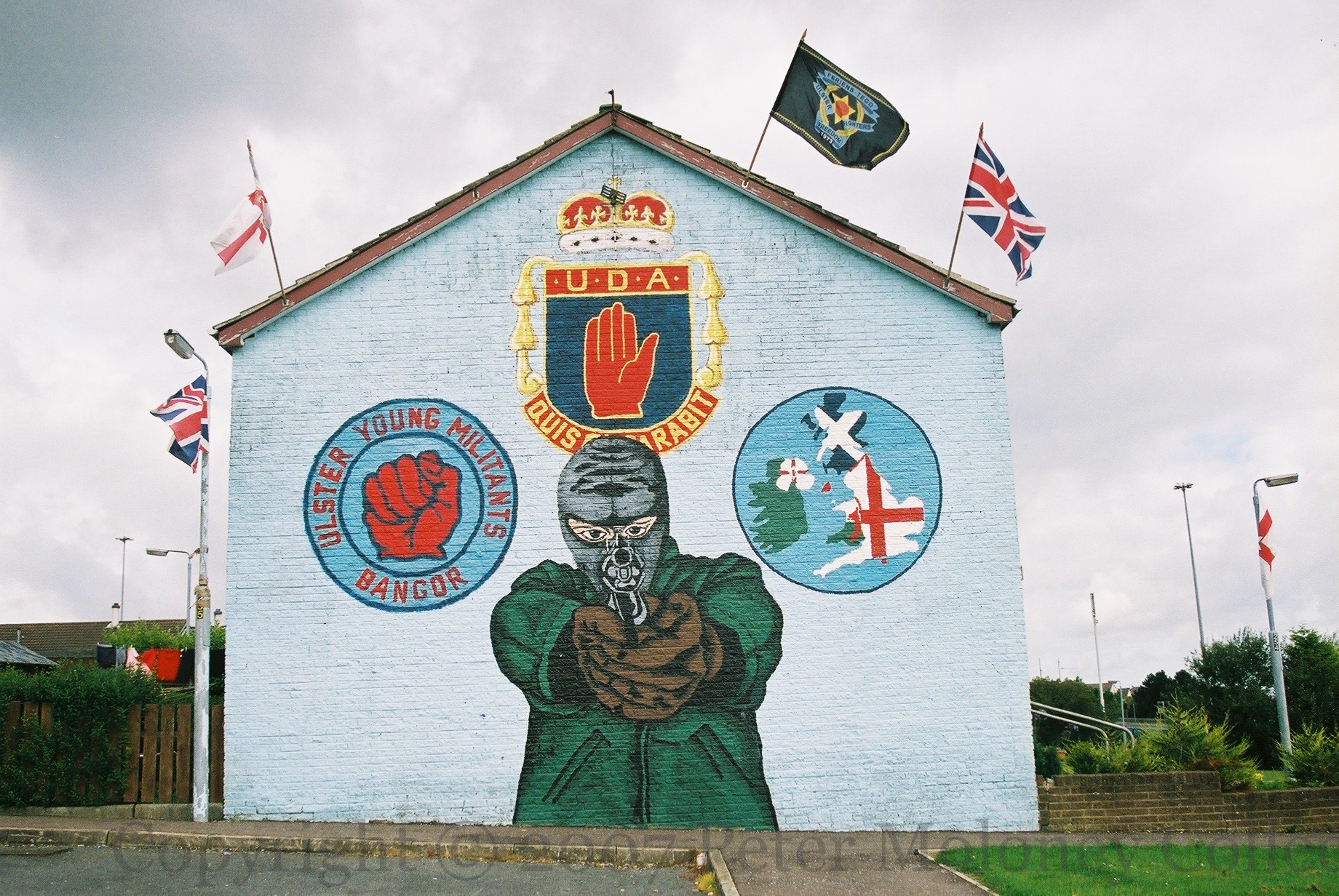 A UDA gunman welcomes you to the Kilcooley estate in Bangor. Ordinarily, the insignia of the Ulster Freedom Fighters would appear alongside those of the UDA and UYM, but in this mural, it is replaced by a map of the “home nations”; the Republic Of Ireland is presented in outline rather than by its flag.