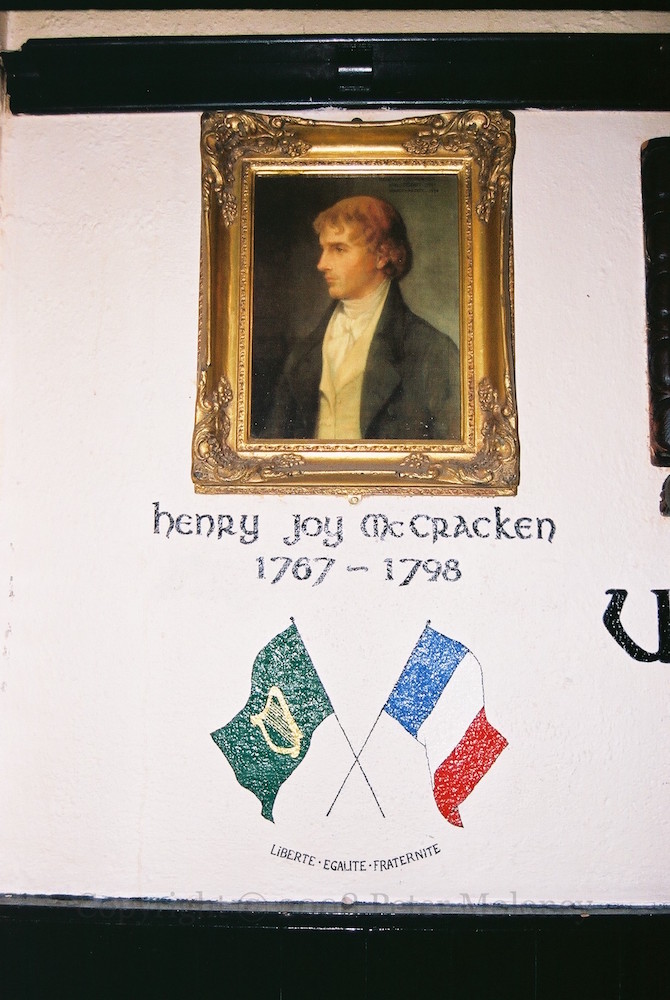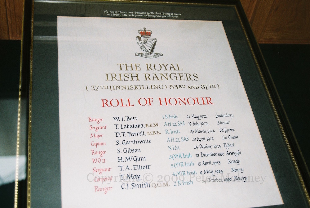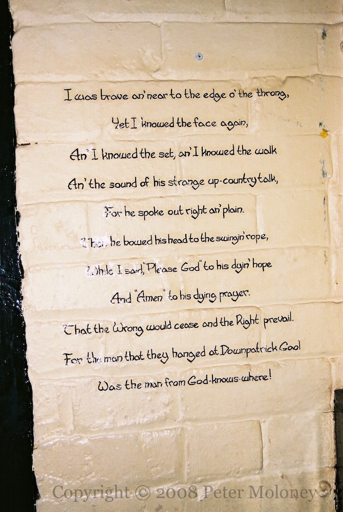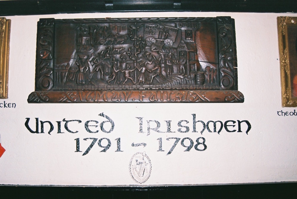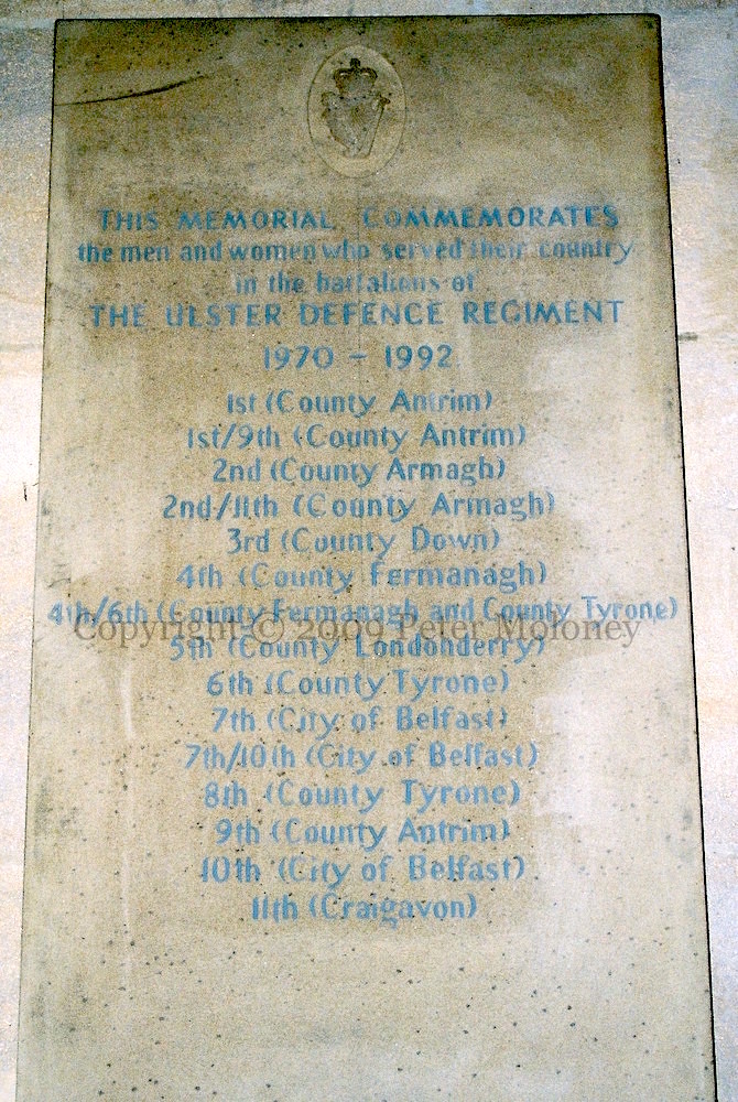 “West Belfast Taxi Association. Dedicated to the memory of Michael Duggan, Harry Muldoon, Patsy McAllister, Caoımhín Mac Bradaıgh, Thomas Hughes, Hugh Magee, Padraıg Ó Cleırıgh, Jim Green. Murdered in the service of their community. A Dhıa dean trócaıre ar an n-anama. May God have mercy on their souls.”