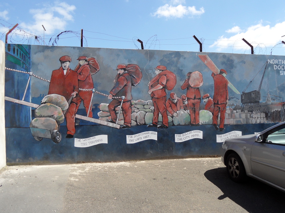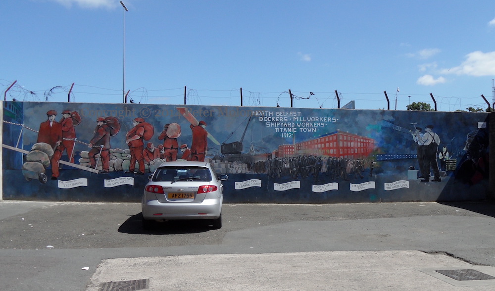 The mural presents a montage of images of “North Belfast dockers, millworkers, shipyard workers” working in “Titanic town 1912”. Along the bottom are the names of various Belfast pubs and other businesses: The Waterloo, The Terminus, The Sportsman’s Arms, The White Hart, The Bowling Green, The City Arms, The Orpheus – York Street, Railway Bar – Canning Street [image from 1970], The Edinburgh Castle [the boat of the Union-Castle line, launched 1910, built at H&W?], York Street Mill, The Gibralter [sic] Bar [whose then-owner was killed in 1972], Ye Old Castle [a bar (and restaurant?) bombed in 1971], The White Lion.