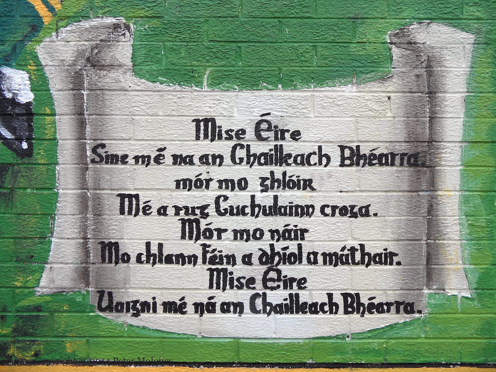 Mıse Éıre: Sıne mé na an Chaılleach Bhéarra. Mór mo ghlóır: Mé a rug Cú Chulaınn croga. Mór mo náır: Mo chlann féın a dhíol a máthaır. [Mór mo phıan: Bıthnaımhde do mo shíorchıapadh. Mór mo bhrón: D’éag an dream ınar chuıreas dóchas.] Mıse Éıre: Uaıgní mé ná an Chaılleach Bhéarra.