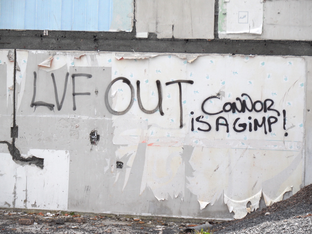 The graffiti on the wall – Welcome to LVF Land – has itself been scored out, and there is also a piece of anti-LVF graffiti in the street.