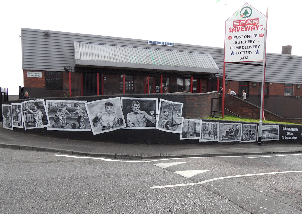From the Tele: “The building was once the home for local Civil Defence during World War II’s ‘Blitz’. This building is now the one of the last remaining Civil Defence structures in Northern Ireland and has also played home to the local Senior Bowls Club for many years.” The mural also shows bombed-out homes and children going off to the countryside. Short documentary about the 1941 Belfast Blitz (youtube).