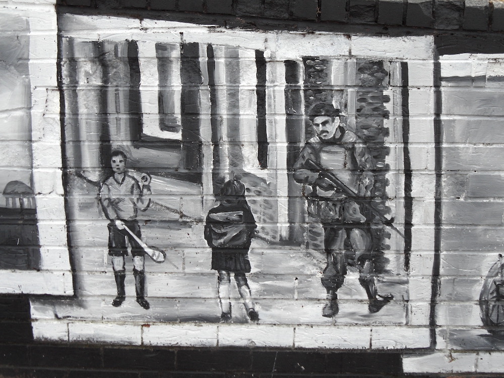 A British soldier patrols the streets while a girl walks home from school and a boy plays hurley. This is one of the panels in the long mural at the shops on Ardoyne Avenue.