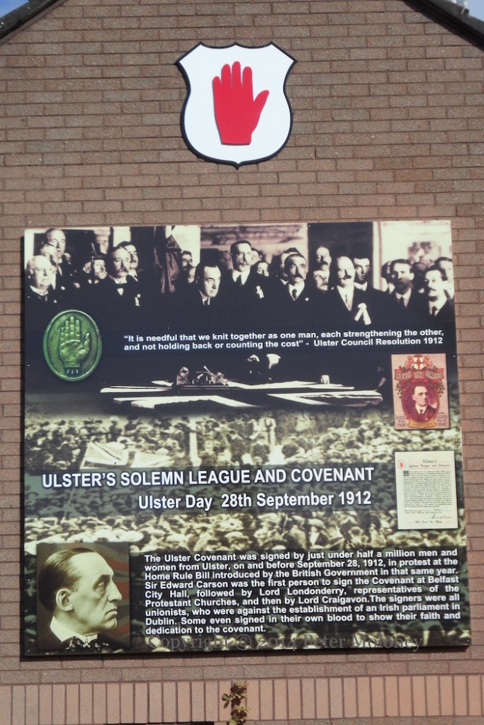 “It is needful that we knit together as one man, each strengthening the other, and not holding back of counting the cost” – Ulster [Unionist] Council Resolution 1912.” “Ulster’s solemn league and covenant. Ulster Day 28th September 1912.” The Council met on September 23rd and 471,000 people signed the covenant (figures here) on or around the 28th – Ulster Day – led by Sir Edward Carson.