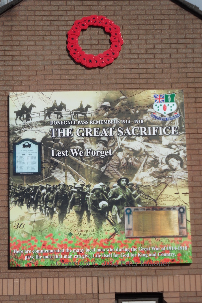 “Donegall Pass remembers 1914-1918 – the great sacrifice. Lest we forget. Here are commemorated the many local men who during the Great War of 1914-1918 gave the most that man can give: life itself for God for King and Country.” With a map of the northern end of the Western Front and images of soldiers marching, on horseback, and in the trenches.