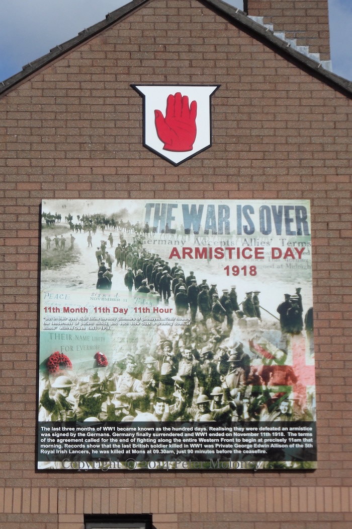 At the bottom: “The last three months of WWI became known as the hundred days. Realising they were defeated an armistice was signed by the Germans. Germany finally surrendered and WWI ended on November 11th 1918. The terms of the agreement called for the end of fighting along the entire Western Front to begin a precisely 11 am that morning. Records show that the last British soldier killed in WWI was Private George Edwin Allison of the 5th Royal Irish Lancers. He was killed at Mons at 09:30 am, just 90 minutes before the ceasefire.”