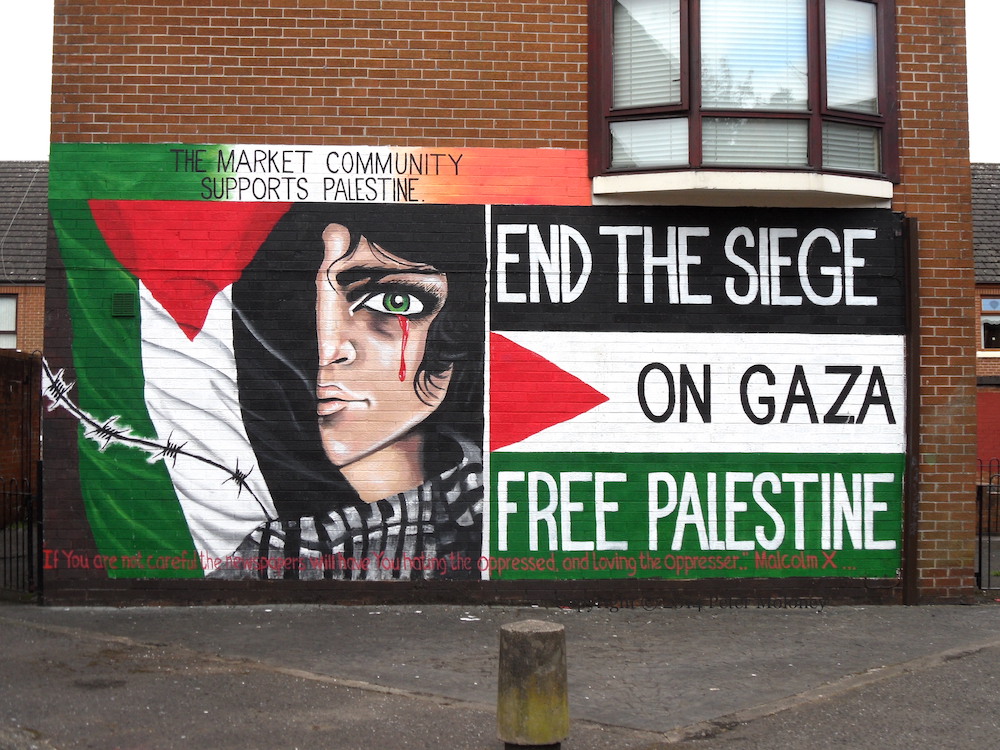 “The Market community supports Palestine – End the siege on Gaza – Free Palestine”. Tears of blood flow from a boy’s face, shrouded by a Palestinian flag and behind barbed wire. Along the bottom, in red lettering, is a quote from Malcolm X’s autobiography: “If you’re not careful, the newspapers will have you hating the [people who are being] oppressed and loving the oppressor [the people who are doing the oppressing].”