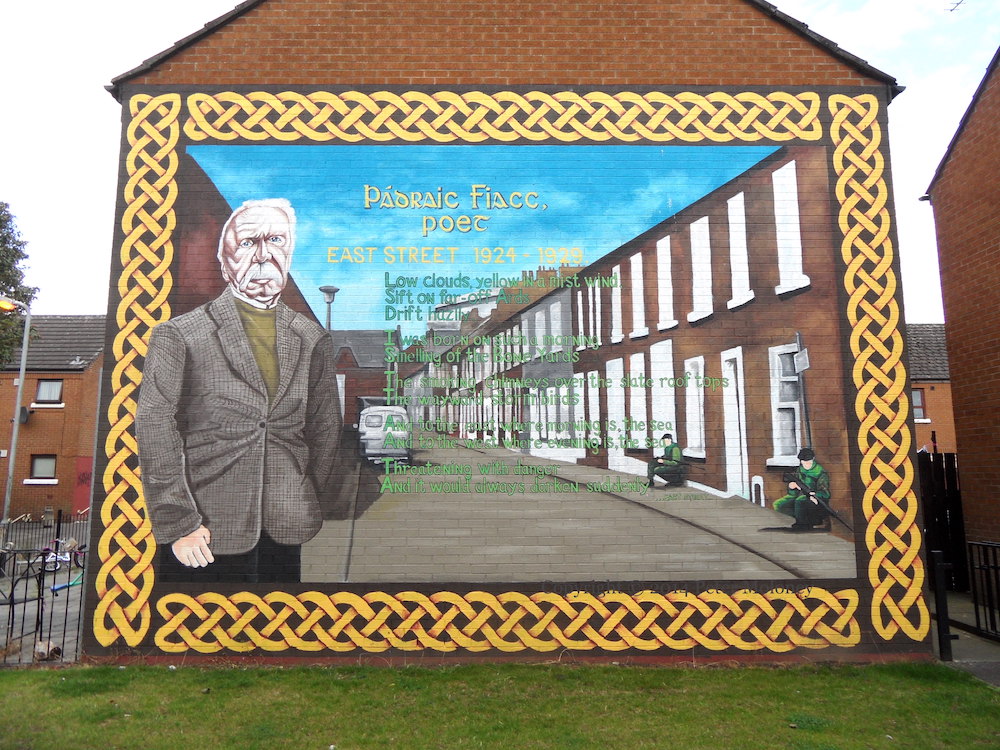 Patrick O’Connor was born on April 15th, 1924, on the lower Falls but after his father emigrated he spent his early years – until age 5 – with his grandparents in East Street in the Markets. It was as a high-schooler in New York that he adopted the name Pádraıc Fıacc (“fıach dubh” is “raven”) and began writing poetry. He settled in Glengormley upon his second and final return; it is not clear that he ever saw East Street lined with British Army soldiers, as shown in the mural above. He wrote of his early life in ‘First Movement’: