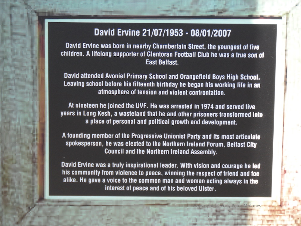 “David Ervine 21st July 1953 – 8th January 2007 David Ervine was born in nearby Chamberlain Street, the youngest of five children. A lifelong supporter of Glentoran Football Club he was a true son of East Belfast. David attended Avoniel Primary School and Orangefield Boys High School. Leaving school before his fifteenth birthday he began his working life in an atmosphere of tension and violent confrontation. At nineteen he joined the UF. He was arrested in 1974 and served five years in Long Kesh, a wasteland that he and other prisoners transformed into a place of personal and political growth and development. A founding member of the Progressive Unionist Party and its most articulate spokesperson, he was elected to the Northern Ireland Forum, Belfast City Council and the Northern Ireland Assembly. David Ervine was a truly inspirational leader. With vision and courage he led his community from violence to peace, winning the respect of friend and foe alike. He gave voice to the common man and woman acting always in the interest of peace and his beloved Ulster.”