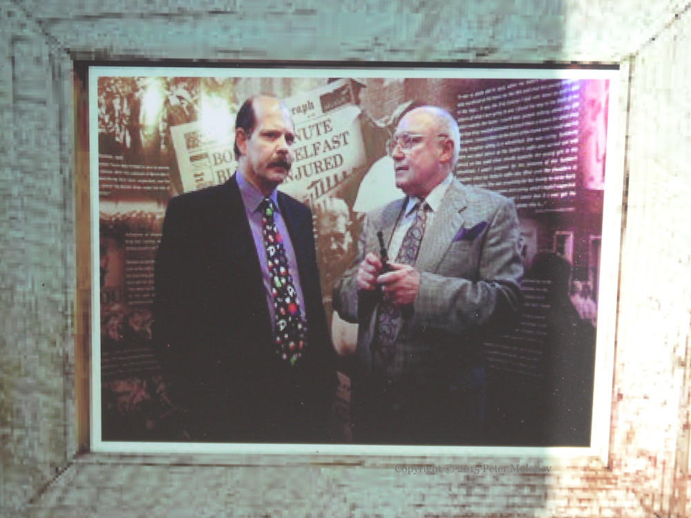 “He had the courage to climb out of the traditional trenches, meet the enemy in no man’s land and play ball with him.” David Ervine was a UVF member, arrested in 1974 and served six years in the Maze before turning to politics: he first ran for office in 1985 and represented East Belfast in the NI Assembly from 1998 until his death in 2007. The board shows Ervine’s silhouette in a wreath of poppies along with pictures of and information about his life, including a photograph of Ervine with Gusty Spence, who is shown holding a pipe.