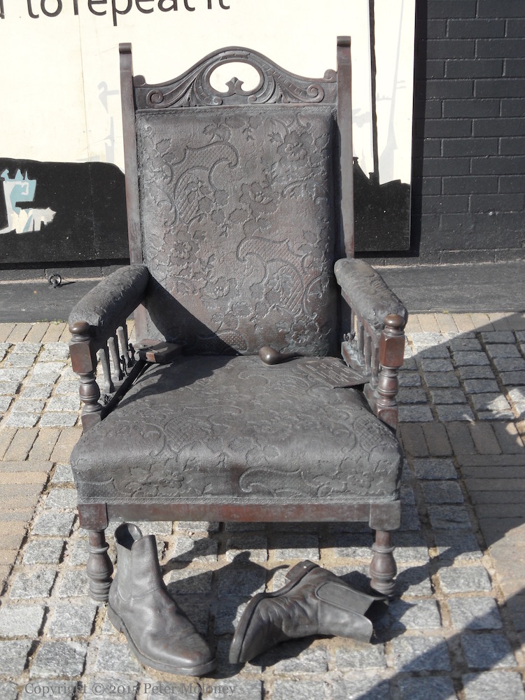 Ervine’s own pipe is included among the items on the “Memory Chair” sculpture by Ross Wilson, along with a ticket for the Titanic and a little (prayer?) book with a poppy on the cover. The prayer book would be for Protestantism, the poppy for loyalism and service in WWI, and the ticket for the shipyard. The boots like the pipe are personal effects of Ervine’s.