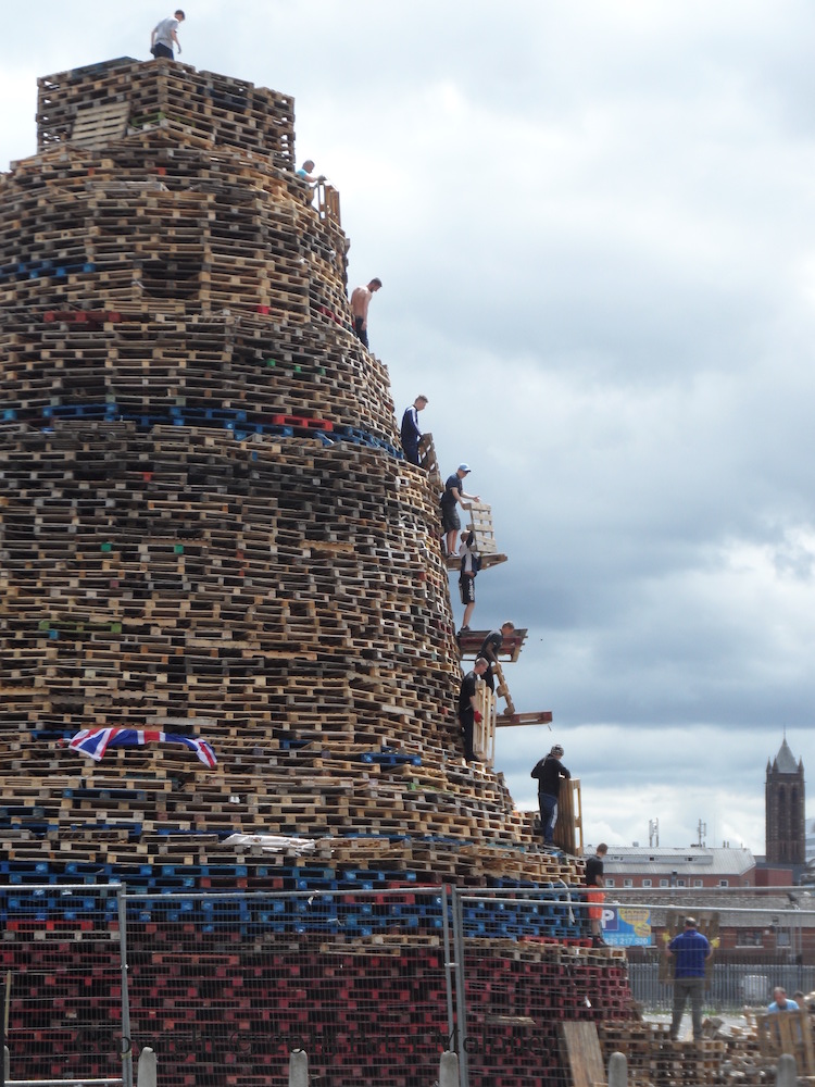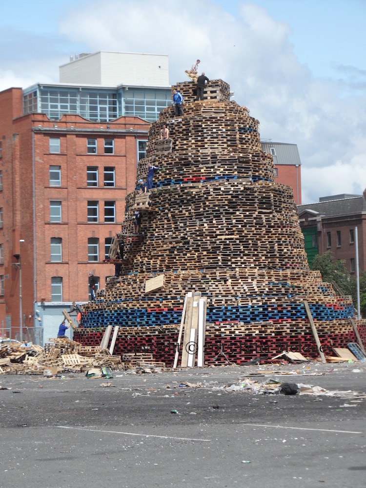 In protest, a giant Tricolour with the words “These are the colours of the Parades Commission” have been added to the side of the Sandy Row bonfire (in the Days Hotel car-park) that is due to be lit this evening – Eleventh Night.