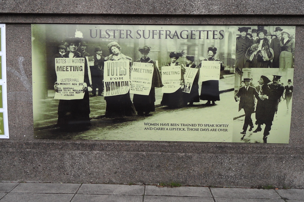 Ulster suffragettes: “Women have been trained to speak softly and carry a lipstick. Those days are over.” (Bella Abzug). The board shows a picture of women drumming up an audience for a suffragette meeting in the Ulster Hall in November 1912. The image in the bottom right is of Emmeline Pankhurst being arrested in London in 1914; the top image is of Pankhurst on tour in the US in 1913 (LoC; see Pieces Of History for a description of the tour; she gave a speech entitled ‘Freedom Or Death’). Pankhurst spoke in Belfast at the 1912 meeting, though the speakers advertised on the placards are “Mrs Charlotte Despard, Miss Irene Miller, Mrs Edith How-Martyn, Miss Alison Neilans“. The first suffrage group in Ireland was the North Of Ireland Women’s Suffrage Society, founded in Belfast in 1872 by Isabella Tod. See also Belfast’s Infamous Prison for information about suffragettes held in Crumlin Road Gaol.