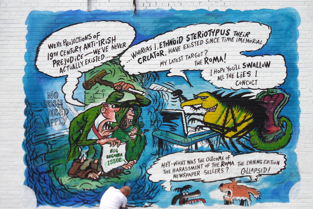 On the left, an Irish family in front of a window reading “No Irish need apply” is stereotyped as jagged-toothed, shillelagh-wielding hunch-backs in the style of Punch and other magazines’ portrayal of the Irish. The Punch portrayal is described, and Punch named explicitly, in the song ‘Do Me Justice’ a.k.a. ‘Here I Am From Donegal’. (Lyrics | audio: Frank Harte (full song) | Len Graham (clip).) They also carry a copy of “The Big Begorra” – a play on The Big Issue, a newspaper published on behalf of, and sold by, homeless people. “We’re projections of 19th century anti-Irish prejudice—we’ve never actually existed.”