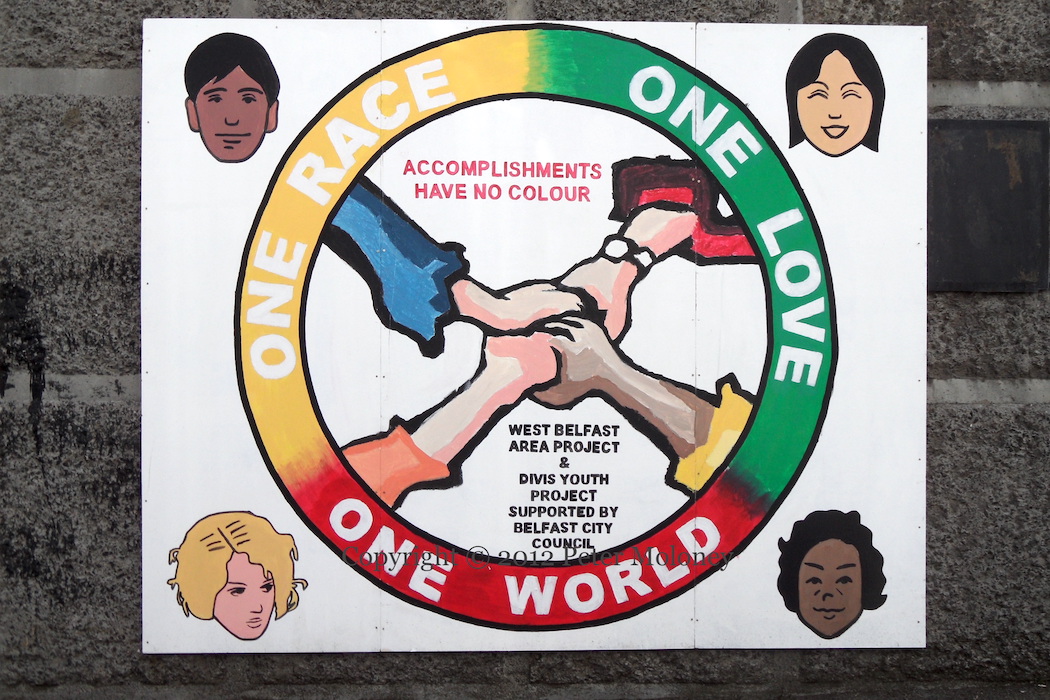 “One race – one love – one world. West Belfast Area Project & Divis Youth Project supported by Belfast City Council.” A wheel of hands from children of different races exhorts residents to overlook differences in skin-tone.