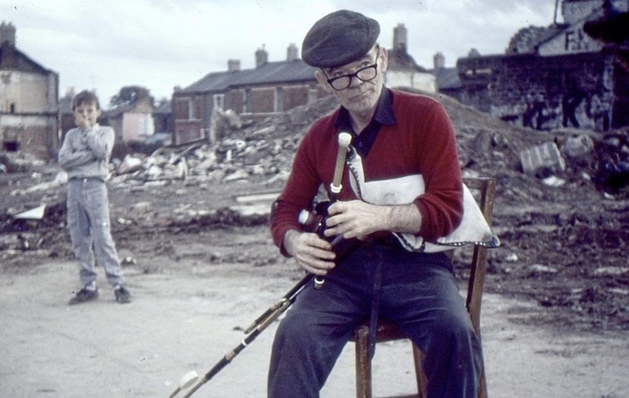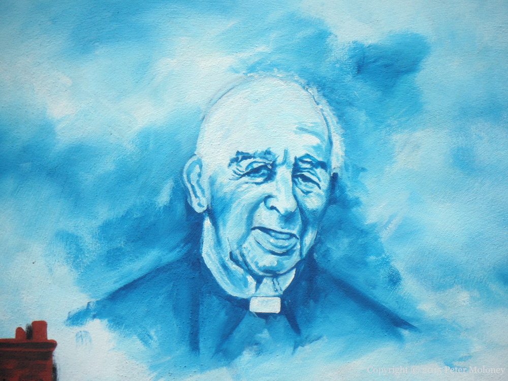 This new mural pays tribute to two long-time residents of Clonard. On a good day, Noel Fitzpatrick, a cobbler with a little shop on the corner of Odessa and Clonard streets, would take his chair out into the street and play the uıleann pipes. Looking down from above is Alec Reid, the Redemptorist priest who spent 40 years at Clonard monastery and played an important role in the peace process. He died in 2013 at age 82. (WP)
