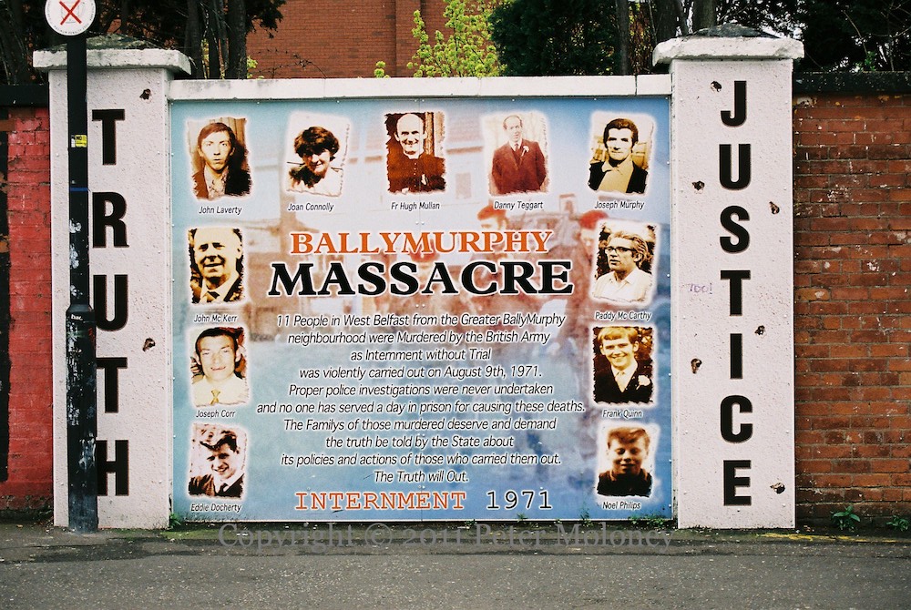 A call for “truth” and “justice” concerning the Ballymurphy Massacre. “11 people in west Belfast from the Greater Ballymurphy neighbourhood were murdered by the British Army as internment without trial was violently carried out on August 9th, 1971. Proper police investigations were never undertaken and no one has served a day in prison for causing these deaths. The familys [sic] of those murdered deserve and demand the truth be told by the state about its policies and actions of those who carried them out.” The 11 are (clockwise) Eddie Docherty, Joseph Corr, John McKerr, John Laverty, Joan Connolly, Fr Hugh Mullan, Danny Teggart, Joseph Murphy, Paddy McCarthy, Frank Quinn, Noel Philips.